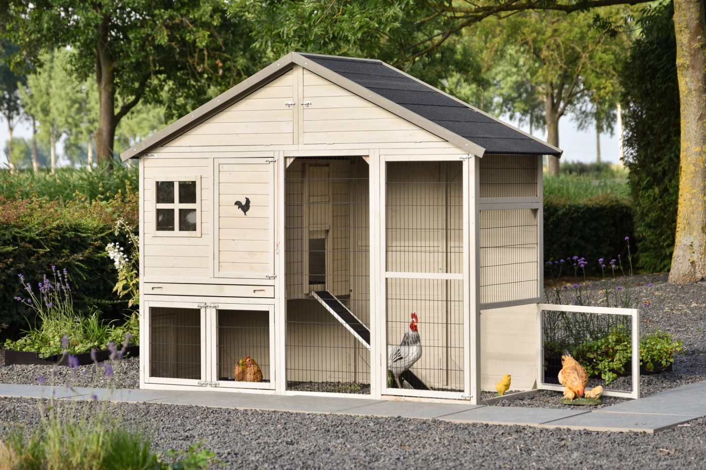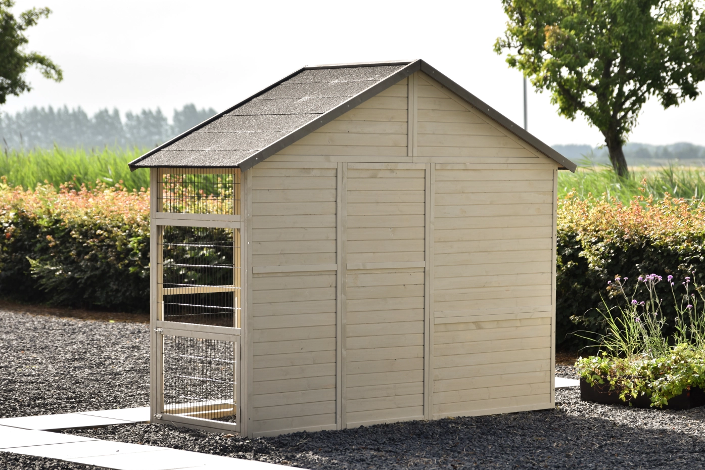 The large chicken coop Holiday Large is attractive, practical, and spacious. This functional coop features a solid wooden back wall and a closed side wall with a small hatch, providing extra shelter for the chickens.