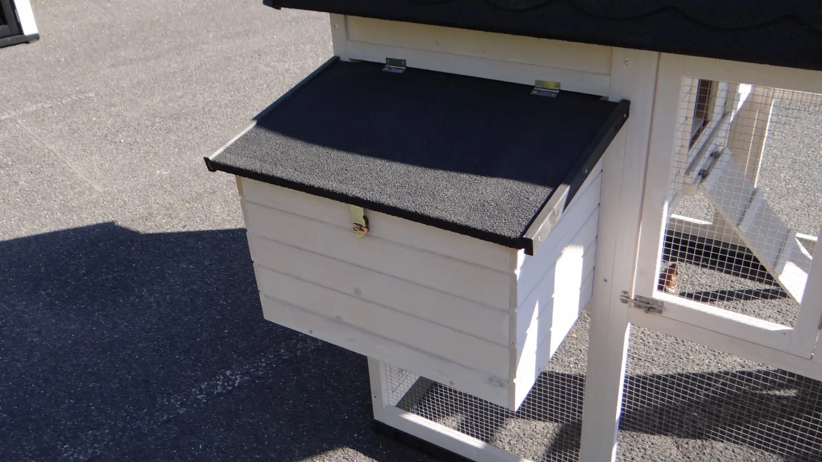 - This chicken coop is equipped with a nest box