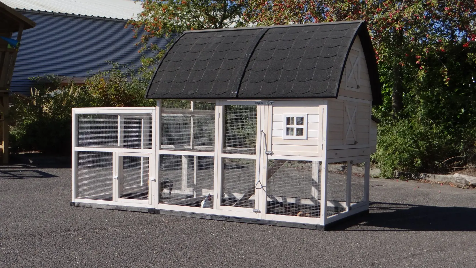 A particularly beautiful and practical large animal enclosure with sleeping area, nesting box, and spacious run.