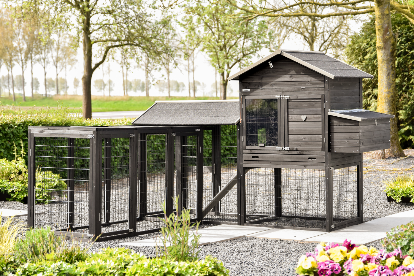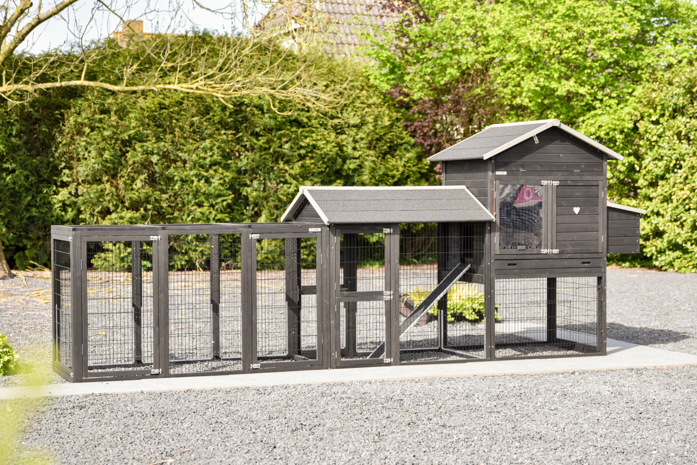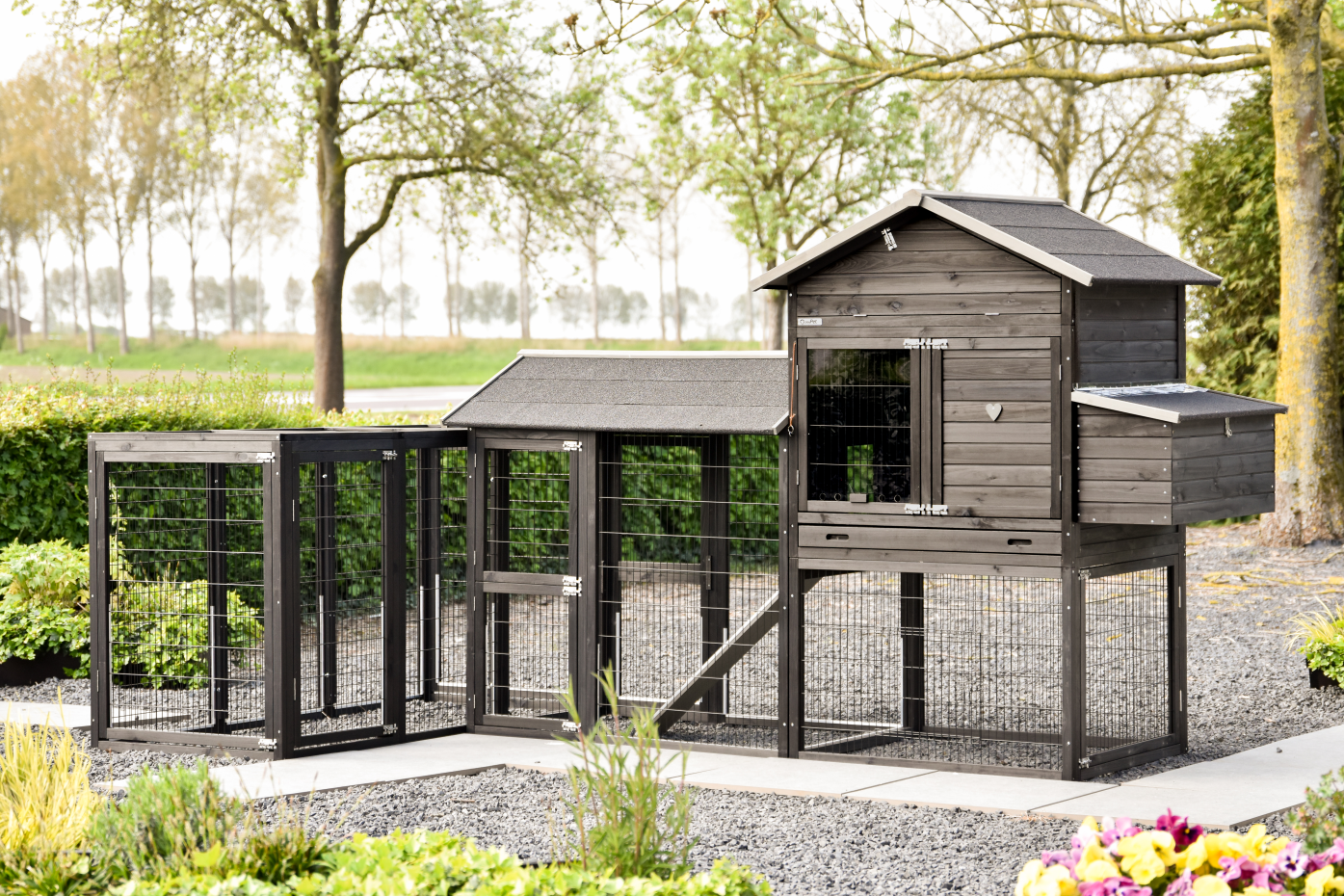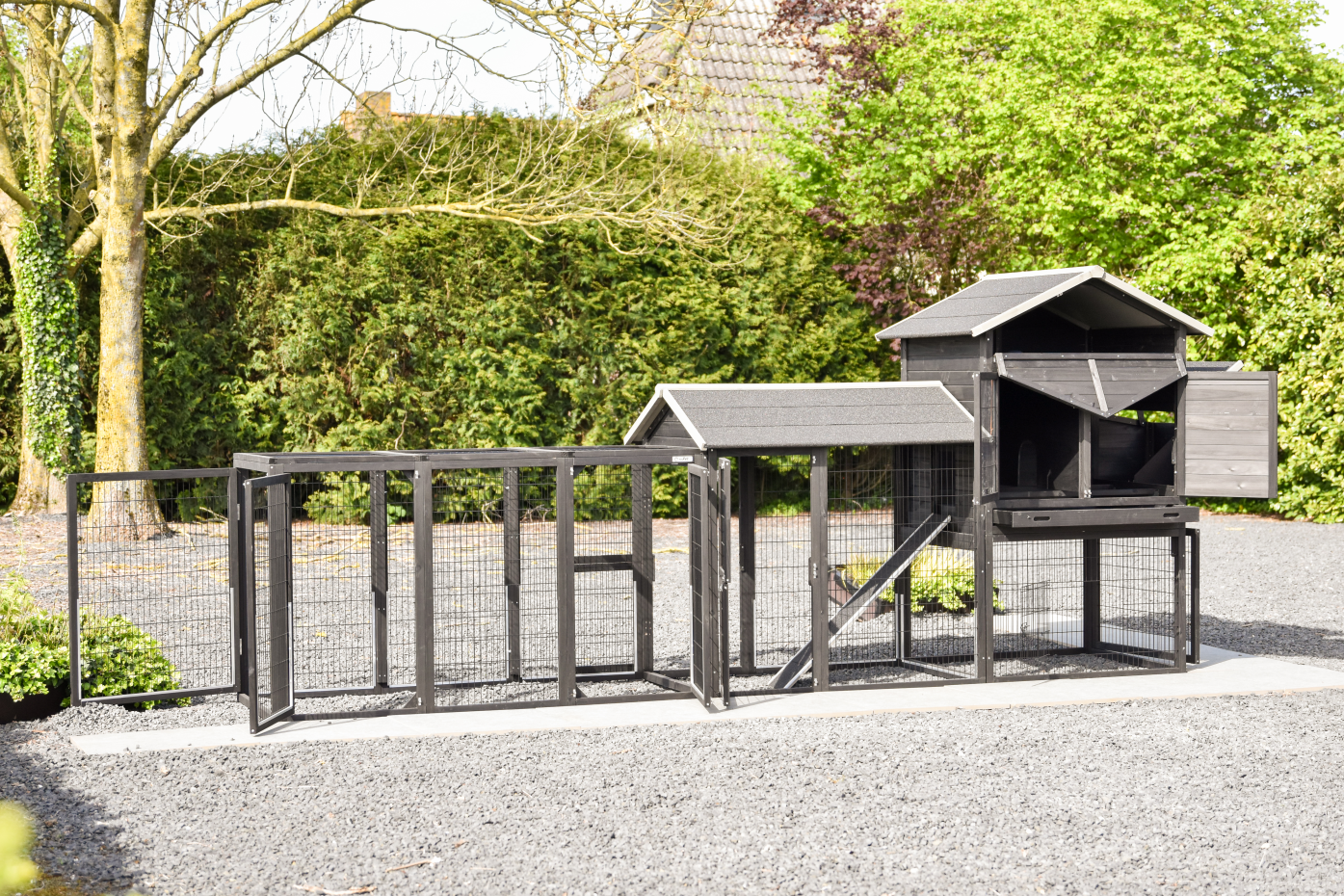 The generous night shelter and convenient nesting box provide comfort and ease of use, while the large doors make maintenance simple
