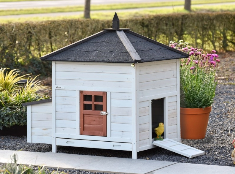 This chicken coop features a convenient pull-out droppings tray.