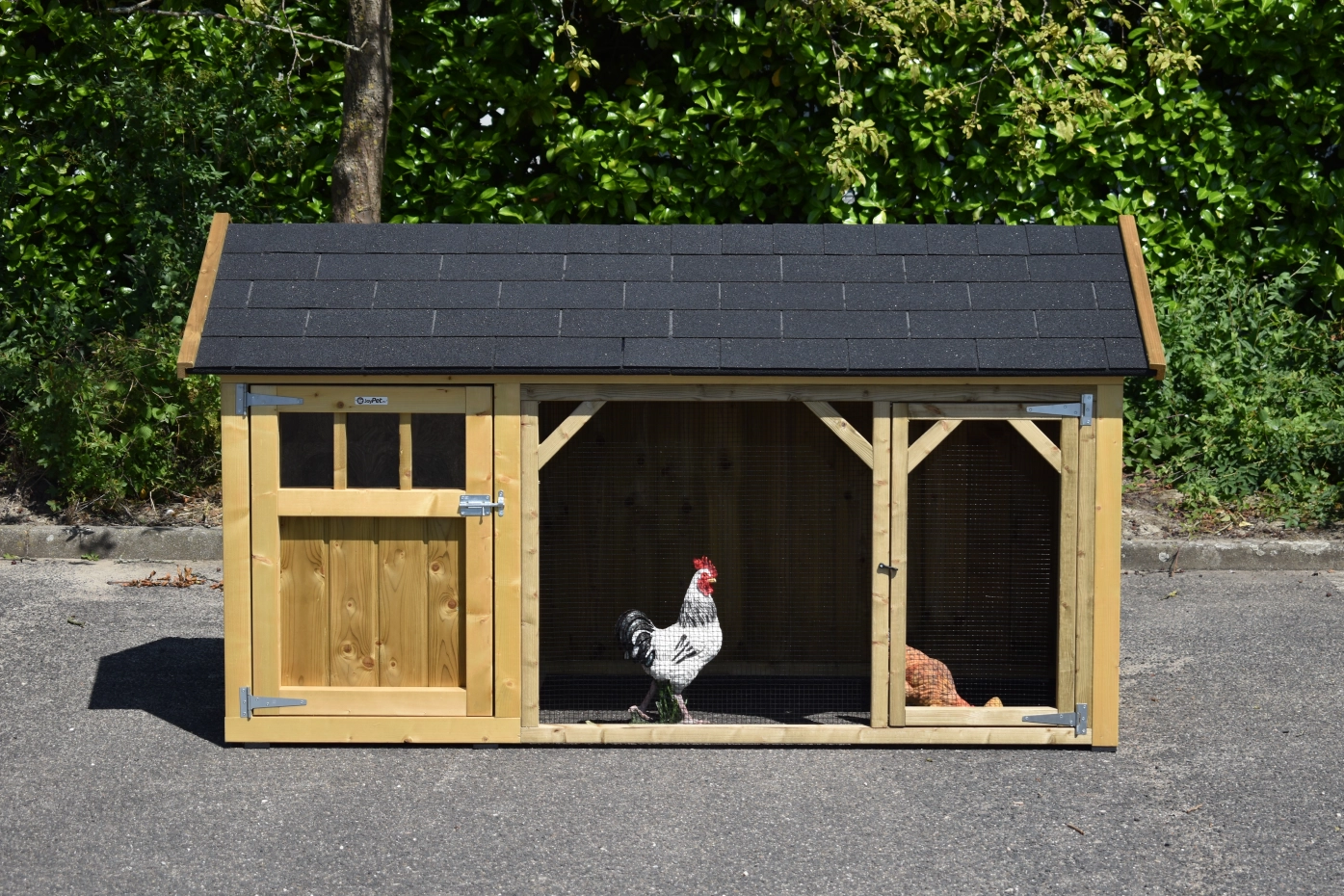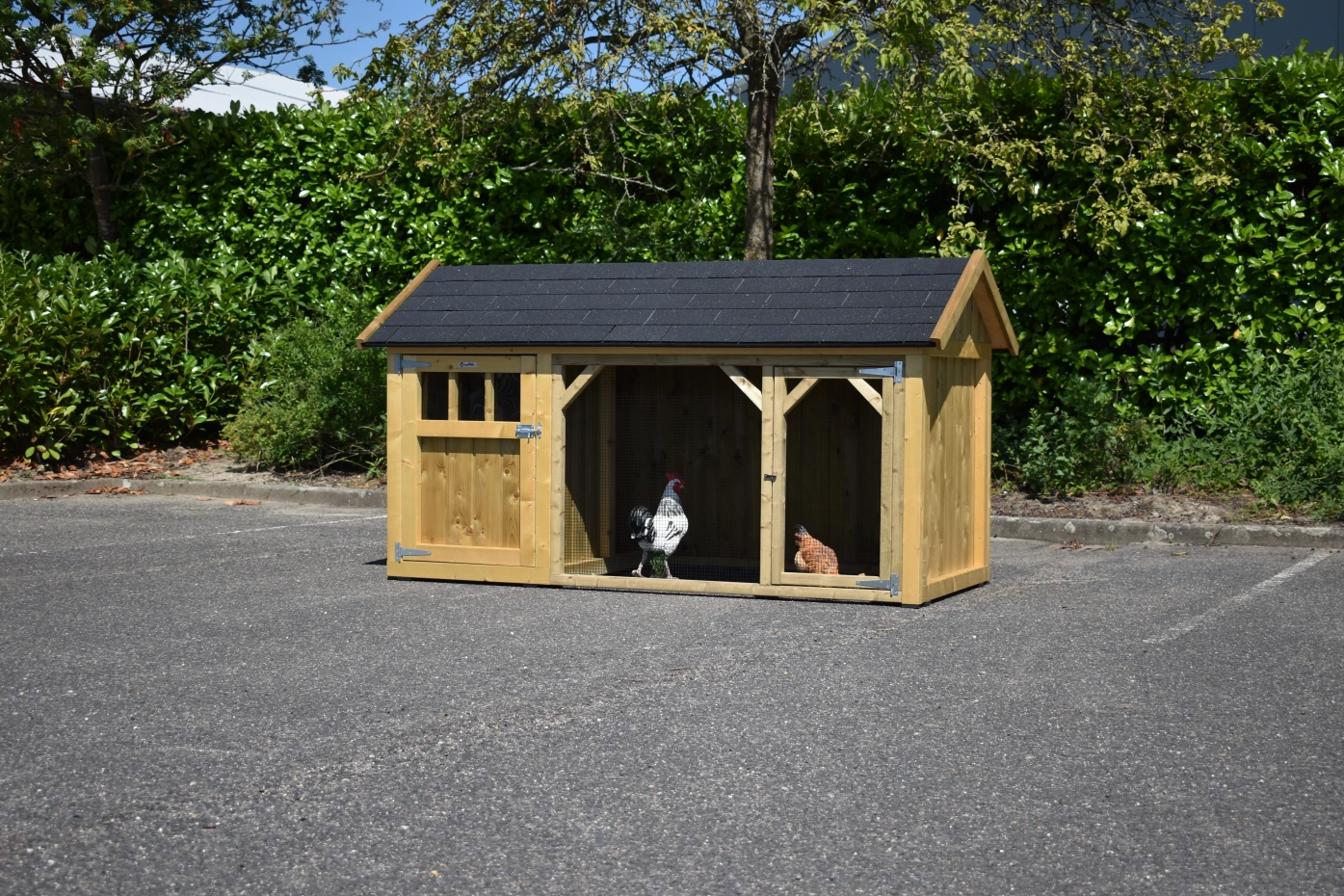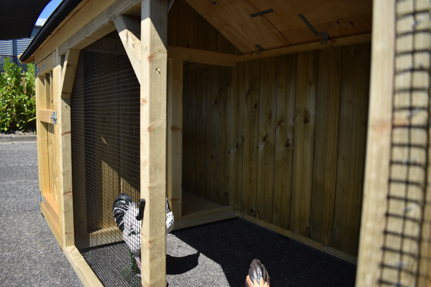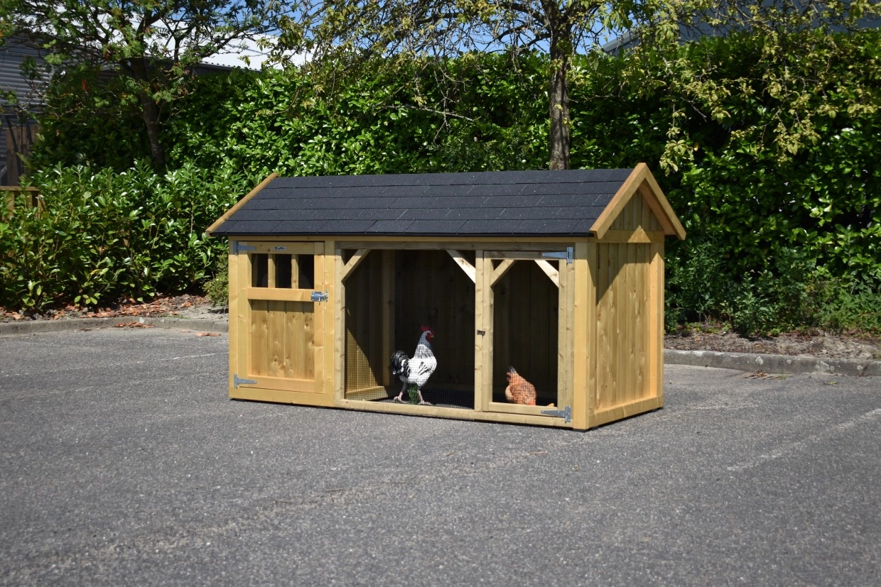 Chickencoop Belle 1 avec a pointed roof is a beautiful hutch with a covered run. The sleeping compartment is provided with a laying box, perches and a floor of pressure treated spruce wood. We make this chickencooop by ourselves in our shop. Because we use high-quality materials, this hutch is almost free from maintenance.