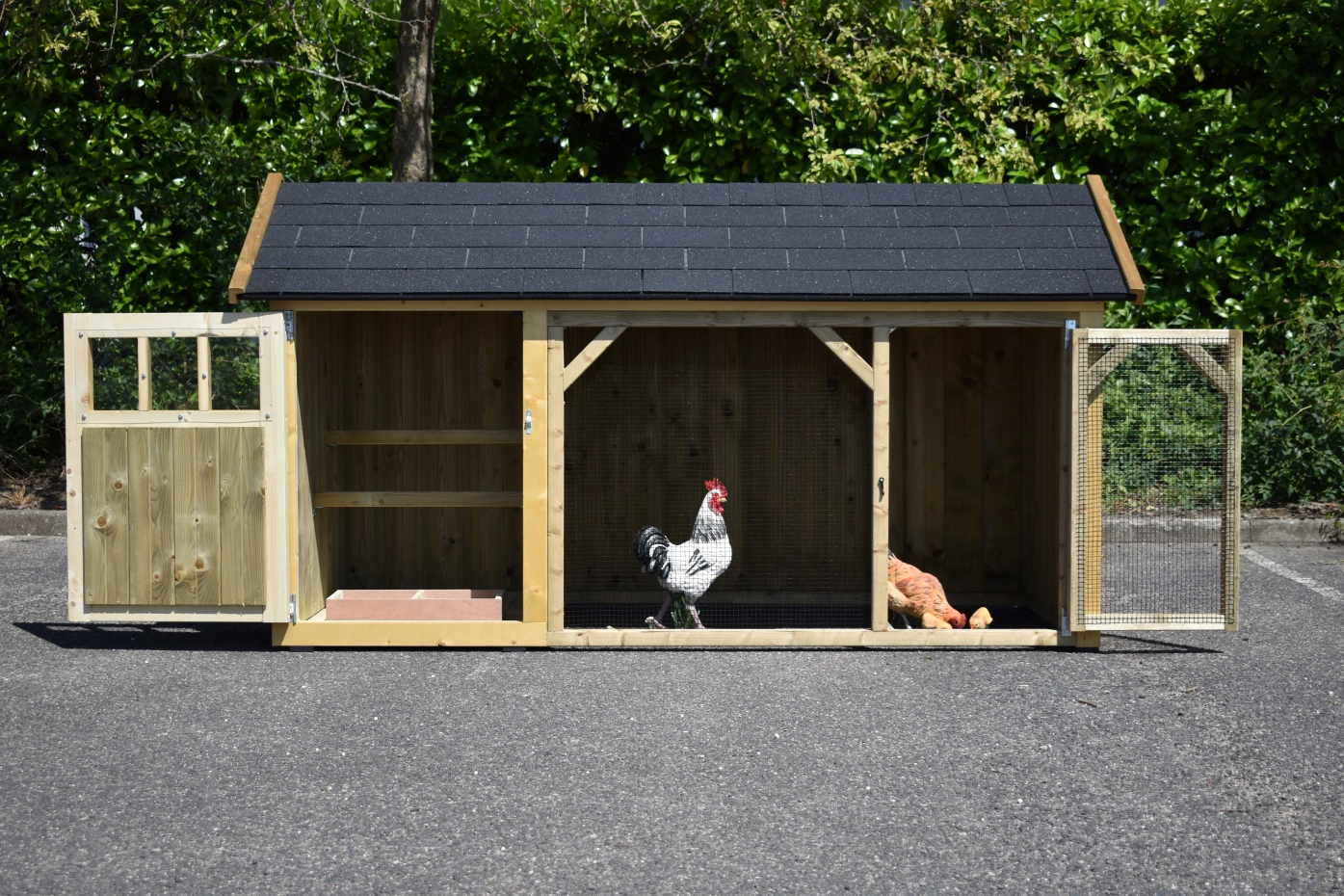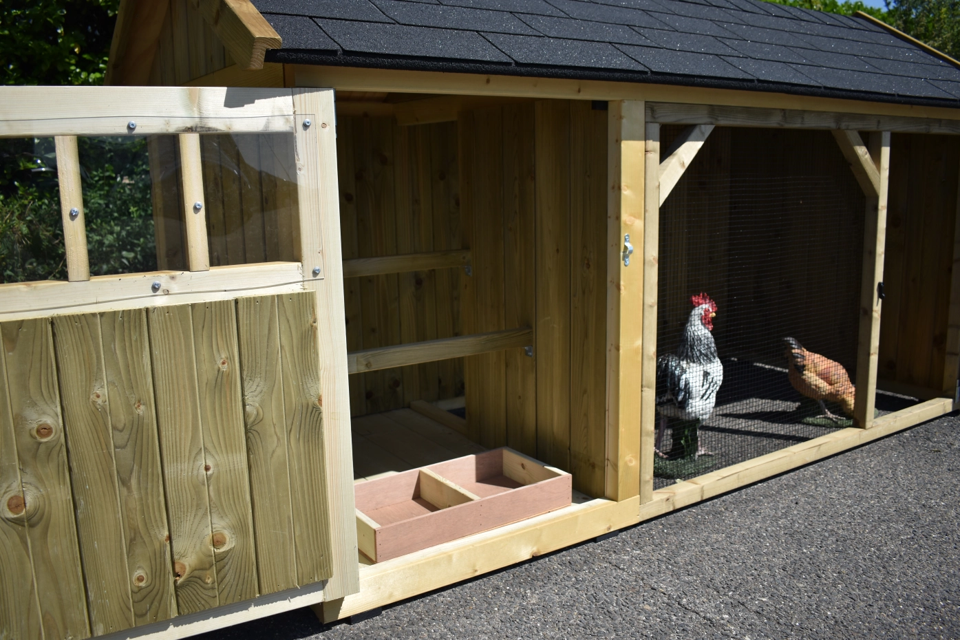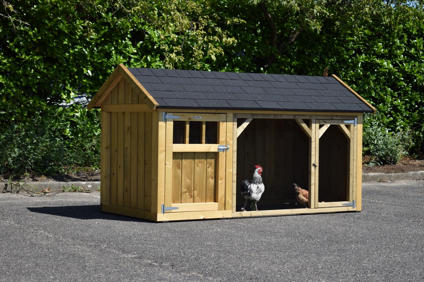 Chickencoop Belle 1 avec a pointed roof is a beautiful hutch with a covered run. The sleeping compartment is provided with a laying box, perches and a floor of pressure treated spruce wood. We make this chickencooop by ourselves in our shop. Because we use high-quality materials, this hutch is almost free from maintenance.