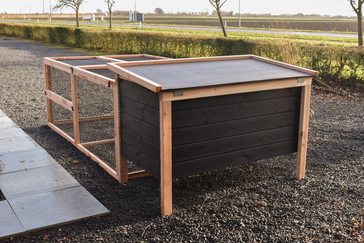 This low model is easy to clean thanks to the hinged roof and the handy front door. The charming detail of a rooster on the door adds extra character to the coop! The combination of Douglas and black gives the hutch a chic appearance.