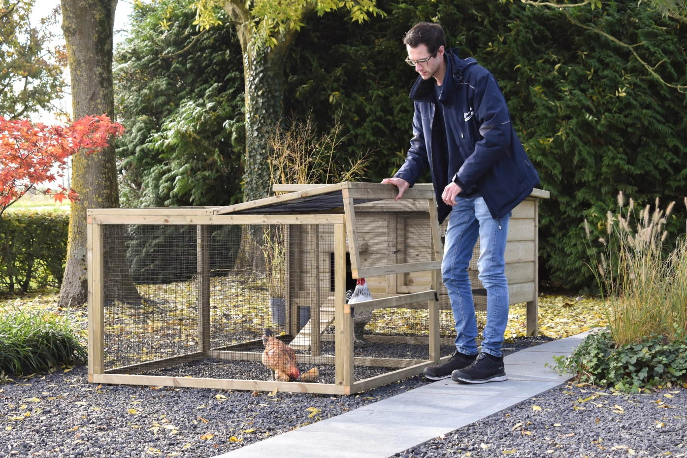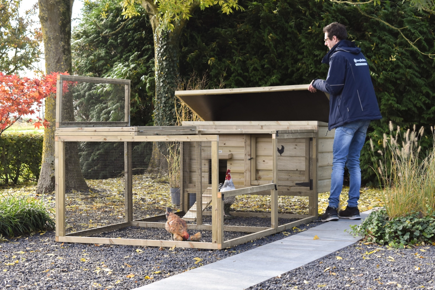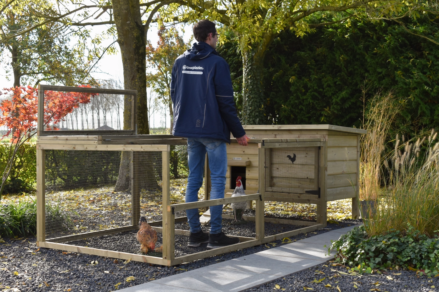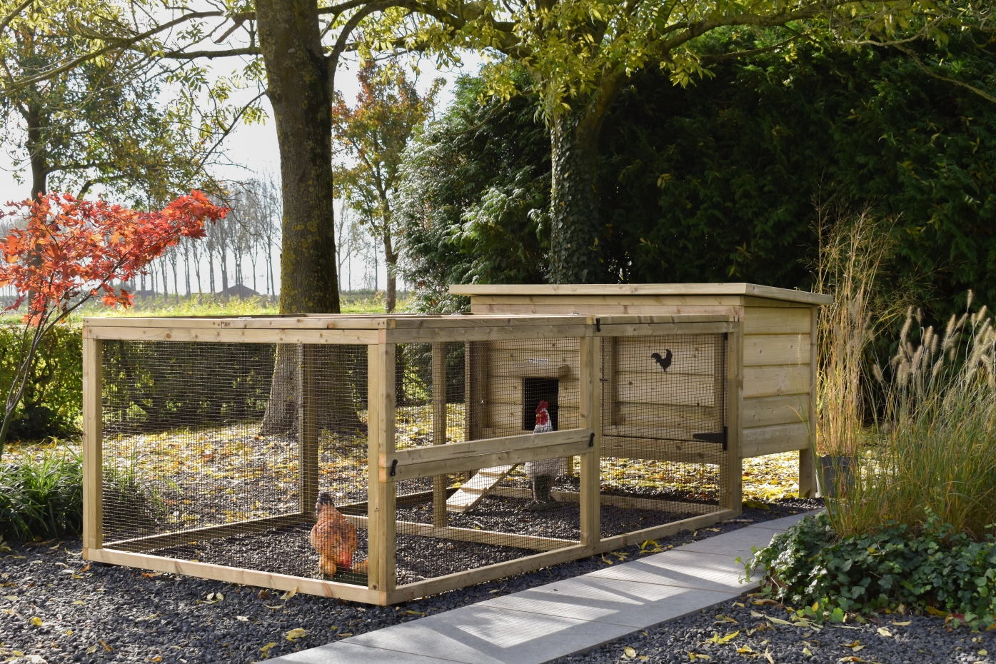 This low model, including a spacious run, offers your chickens plenty of room to scratch and stay active. The coop and run are easy to clean thanks to the hinged roof and the handy front door of the coop. For a lovely detail on the door, you can order a cute wooden animal. This gives the coop an extra charming look!