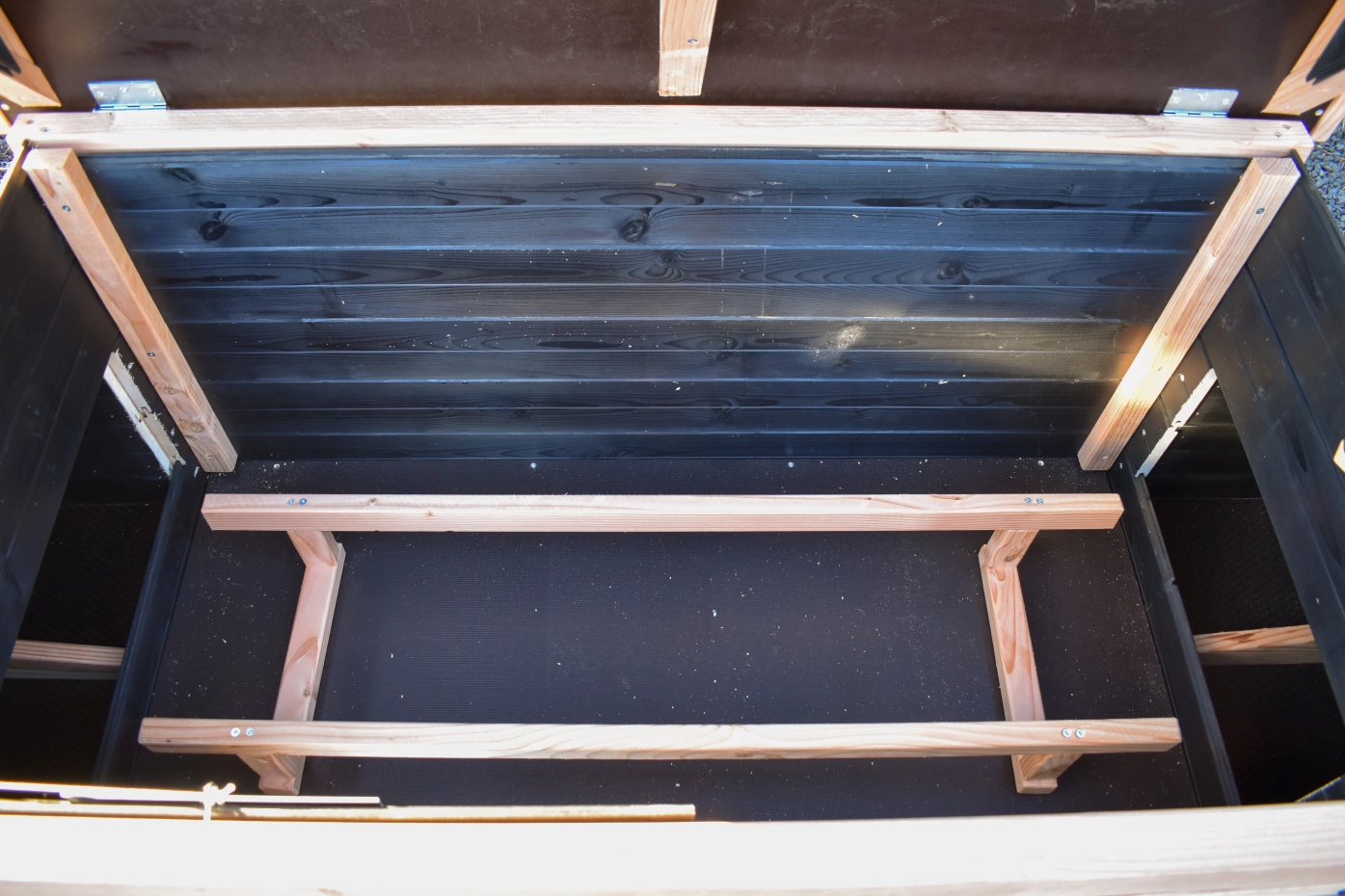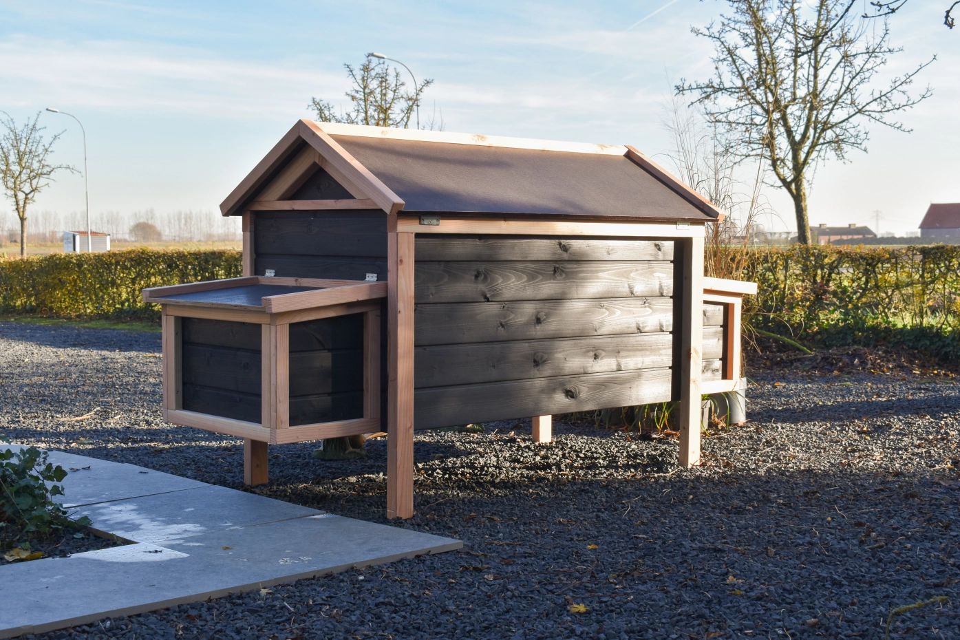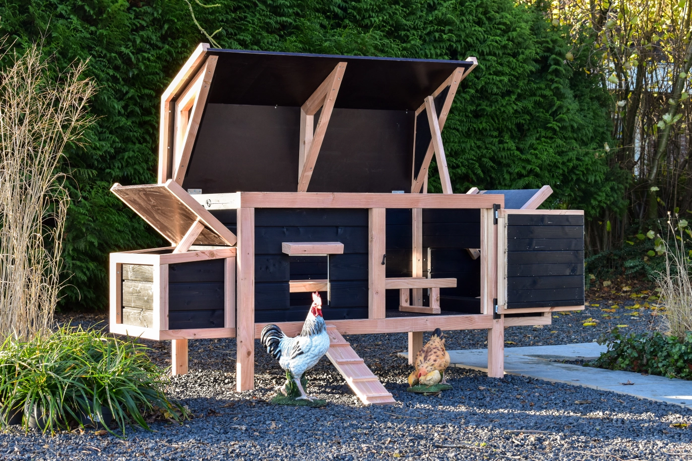 This low model with 2 nesting boxes is easy to clean thanks to the hinged roof and the handy front door. The nesting boxes also feature hinged roofs and removable floor plates. The combination of Douglas and black gives the coop a chic appearance.
