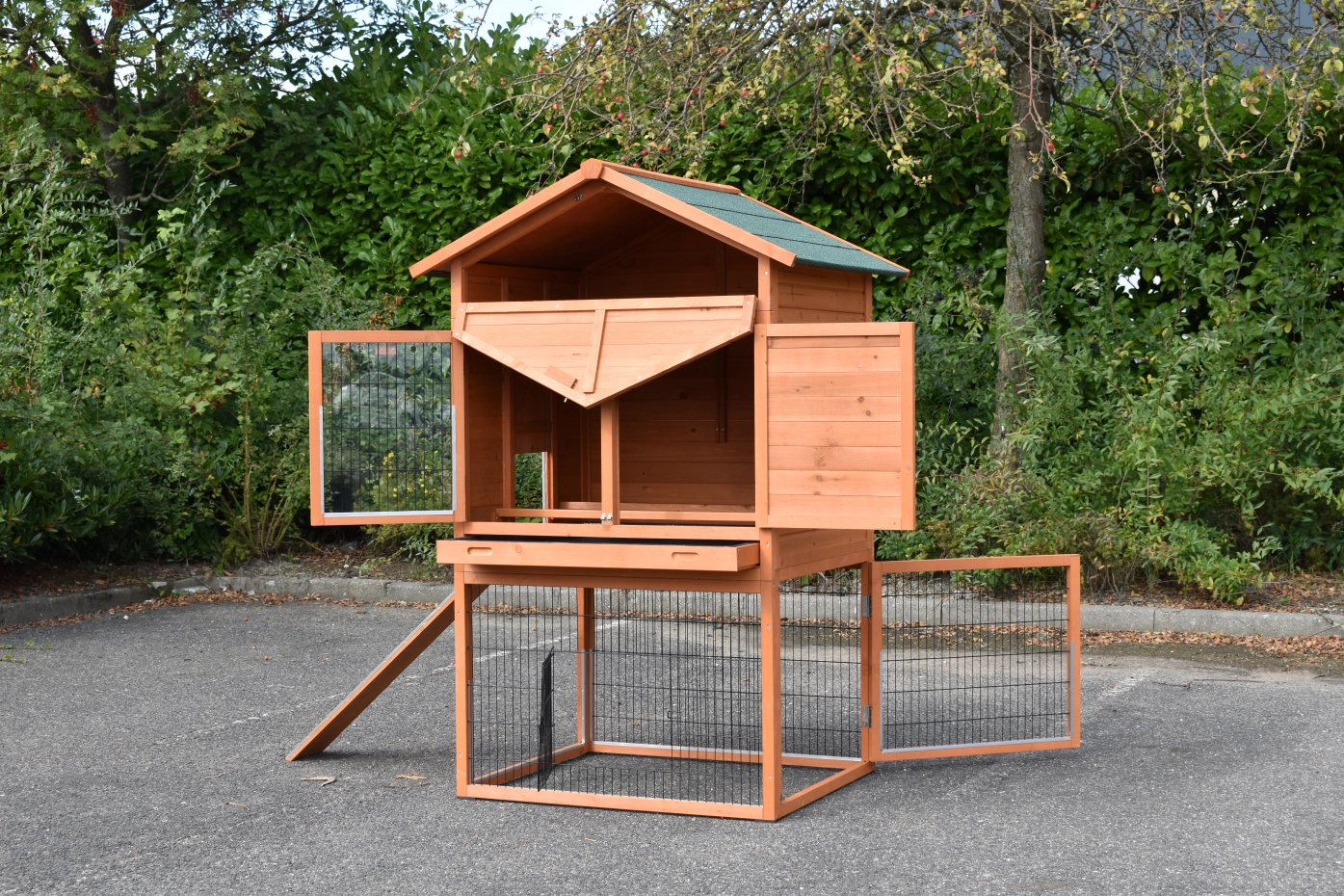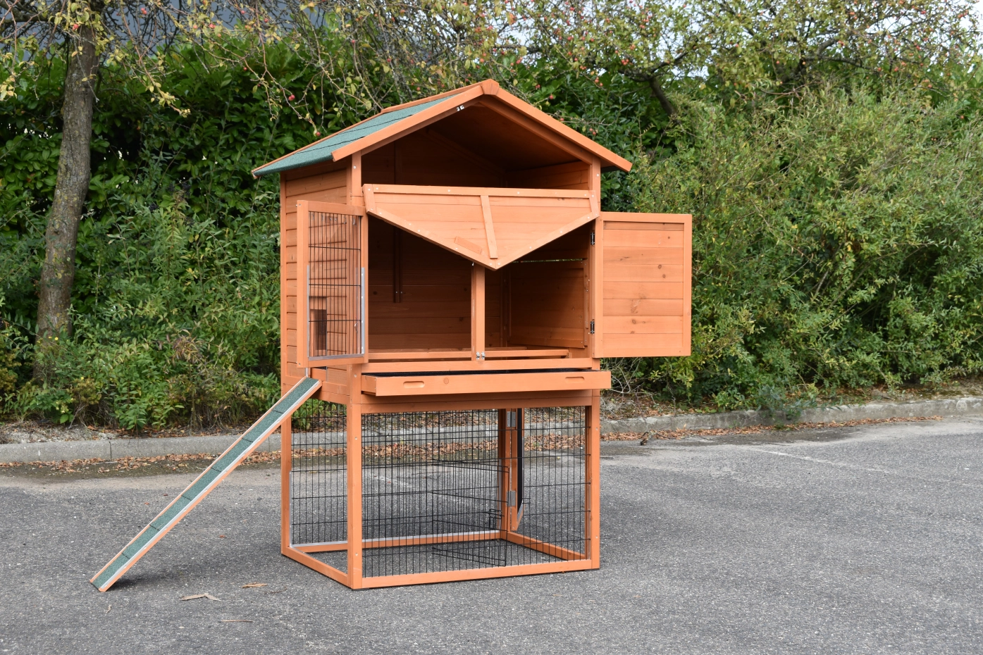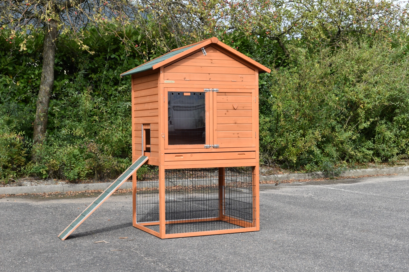 • The roof of this rabbit hutch is equipped with roofing felt