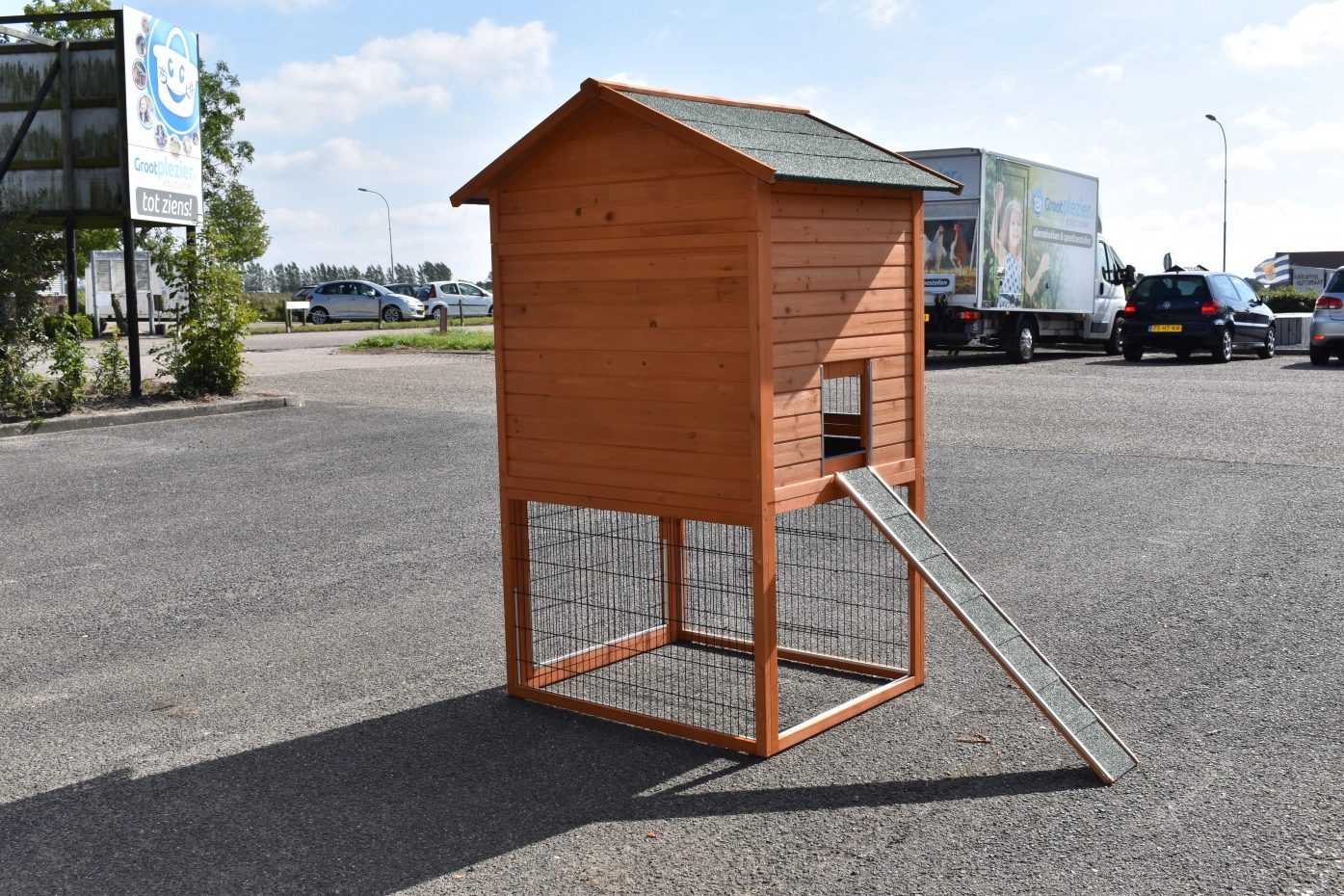 This large chicken coop is beautifully finished in every detail, featuring spacious doors and a generous sleeping area.