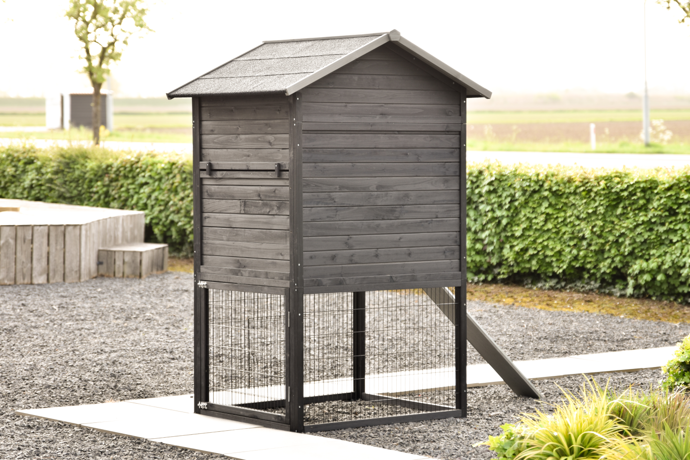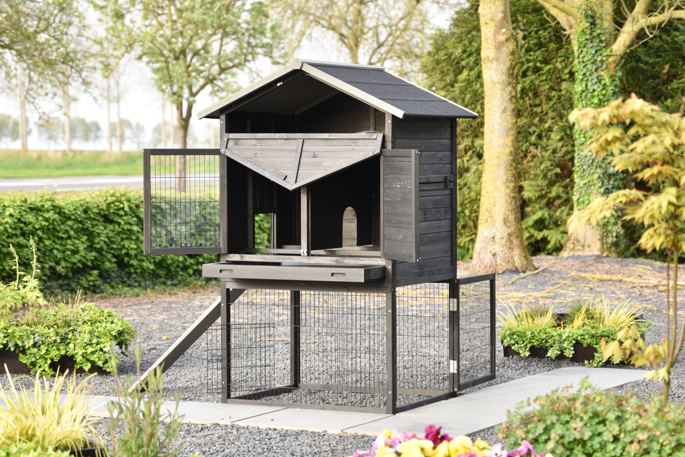 This large chicken coop is beautifully finished in every detail, featuring spacious doors and a generous sleeping area.