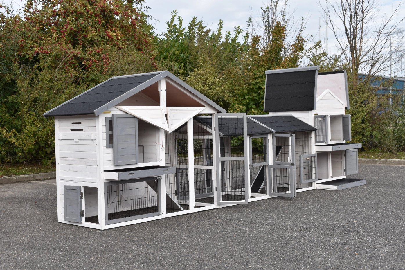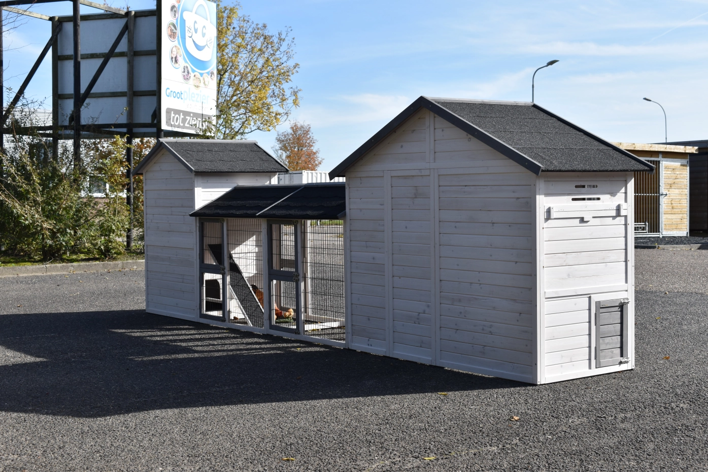 The chickencoop Holiday Medium has been expanded with the coop Double Medium and 2 runs. The chickencoop Holiday Medium has a sliding tray and a convenient attic. The chickencoop Double Medium has 2 separate sleeping compartments, each with a sliding tray. This coop also has an attic. This large combination is suitable for 9 large or 15 small chickens.