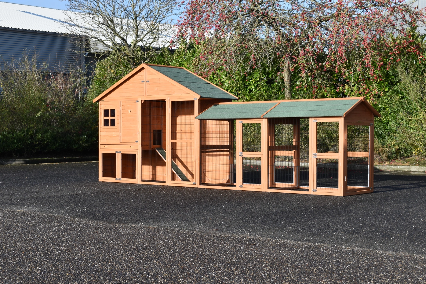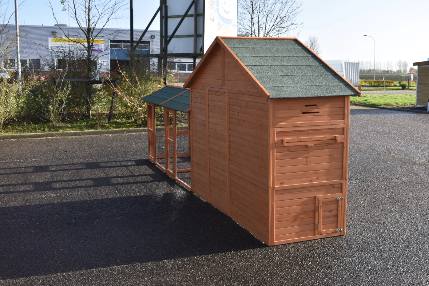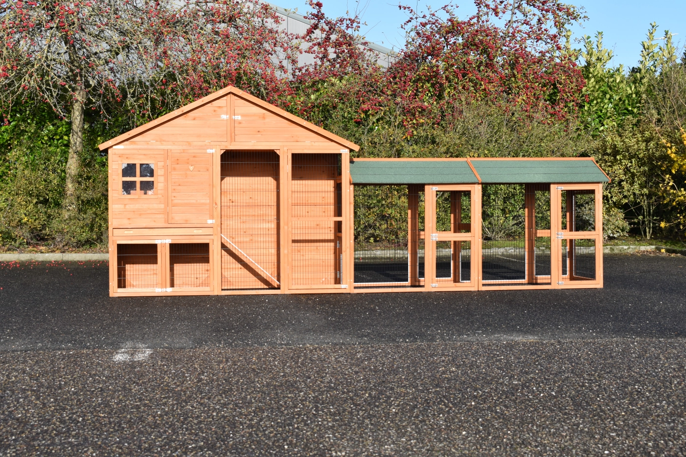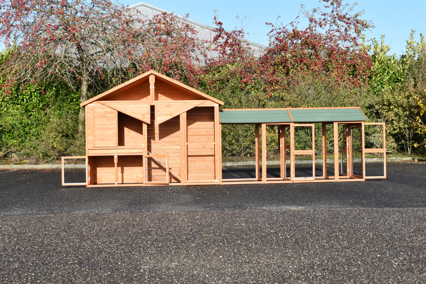 Large chickencoop Holiday Large is a beautiful, practical and spacious chickencoop with a sleeping compartment and 2 Space Large runnings. This beautiful hutch is provided with many doors, the sleeping compartment has 2 perches. Above the sleeping compartment is a storage attick.The sleeping compartment of the hutch is suitable for ca. 4-10 chickens.