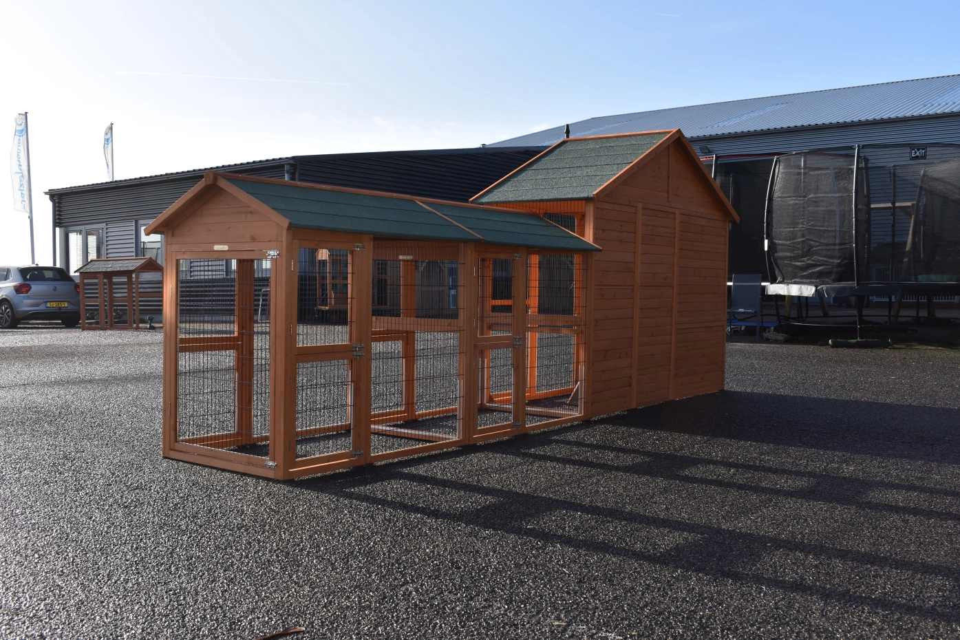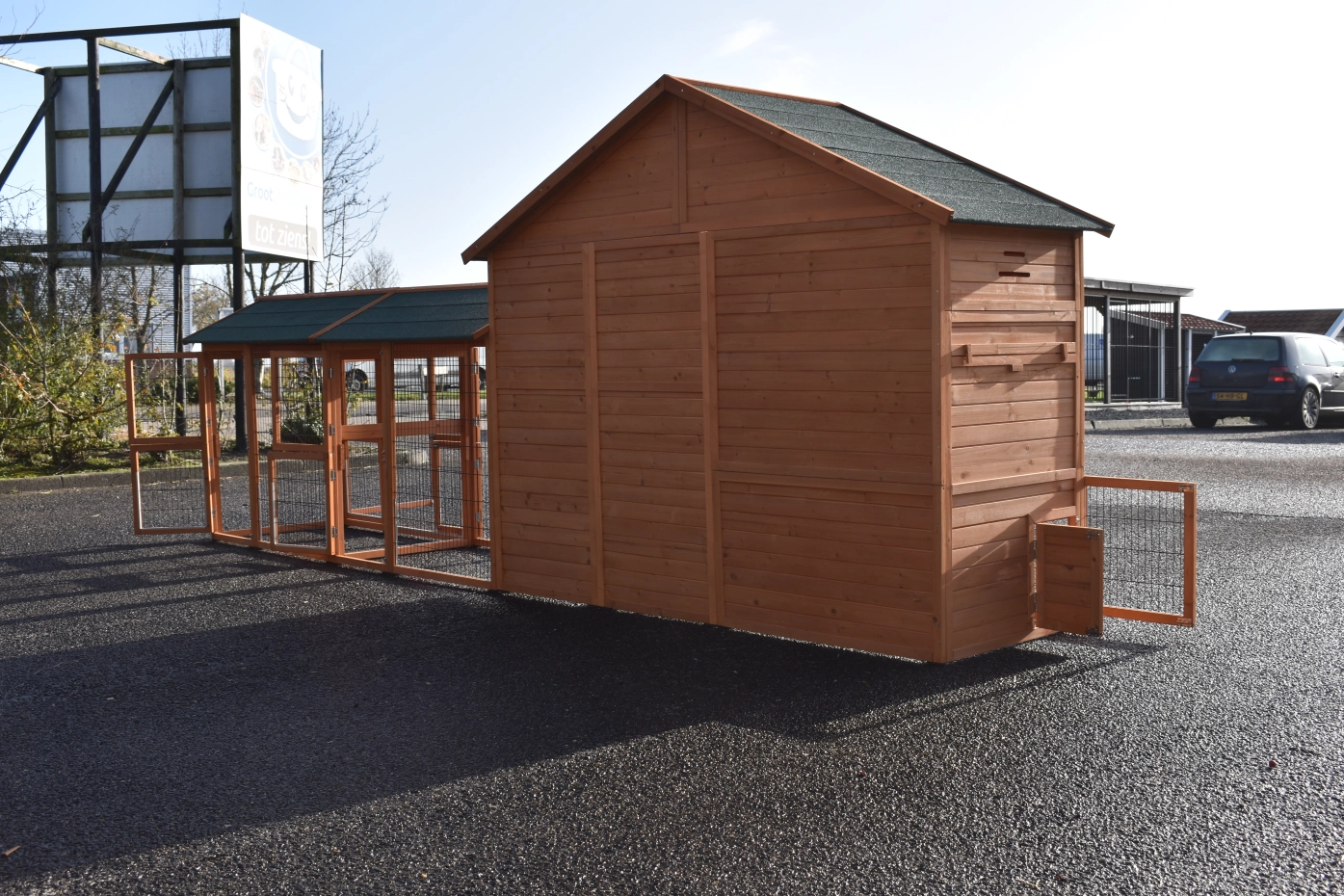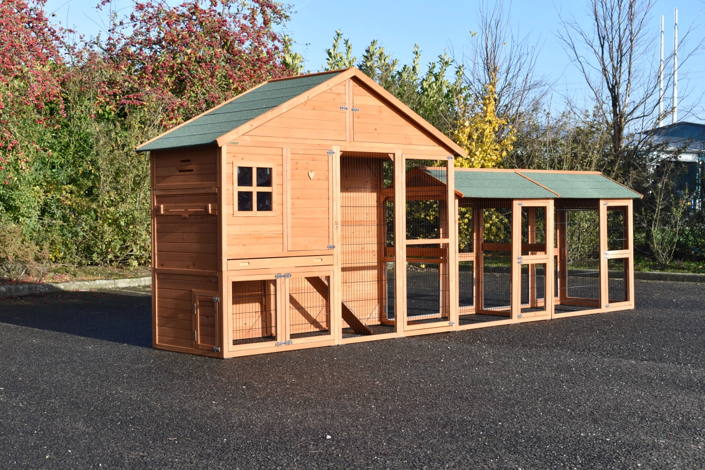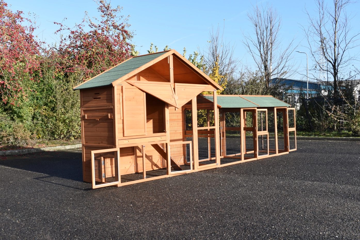 Large chickencoop Holiday Large is a beautiful, practical and spacious chickencoop with a sleeping compartment and 2 Space Large runnings. This beautiful hutch is provided with many doors, the sleeping compartment has 2 perches. Above the sleeping compartment is a storage attick.The sleeping compartment of the hutch is suitable for ca. 4-10 chickens.