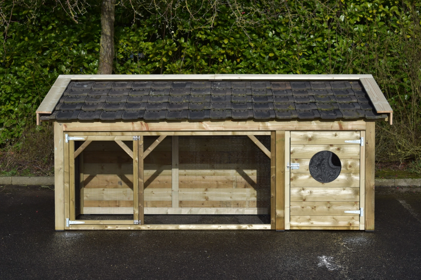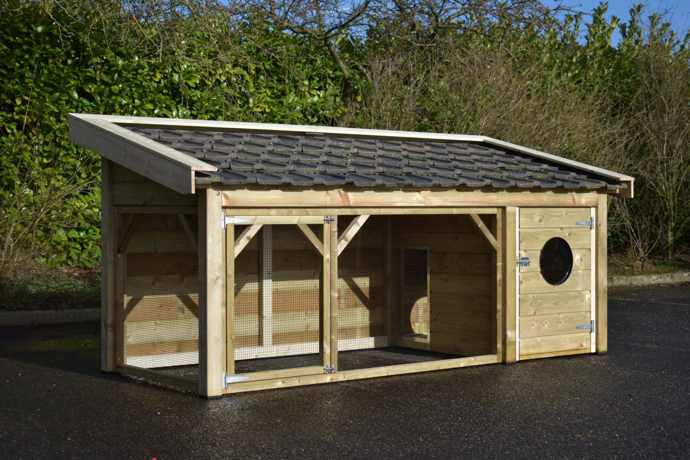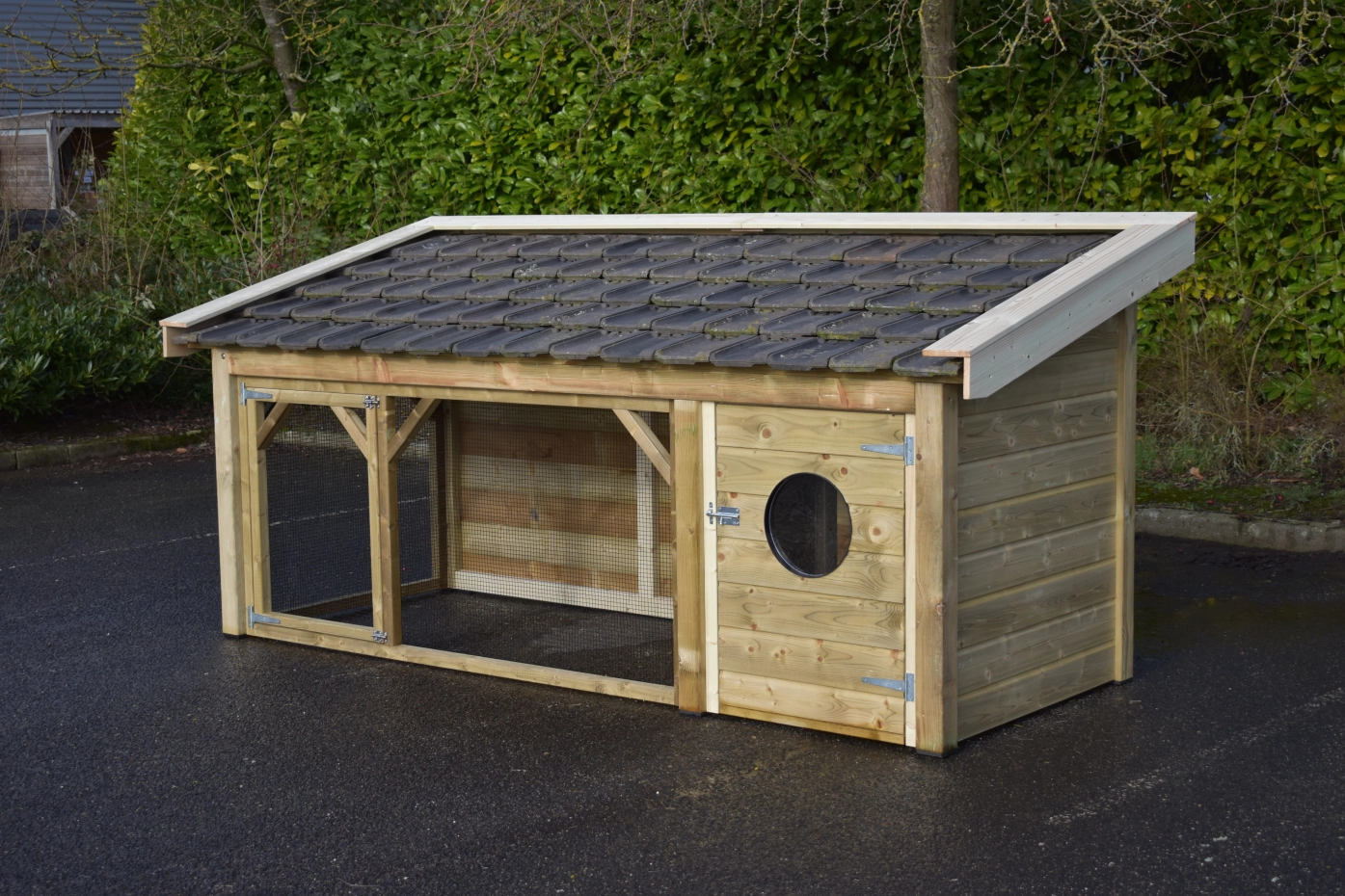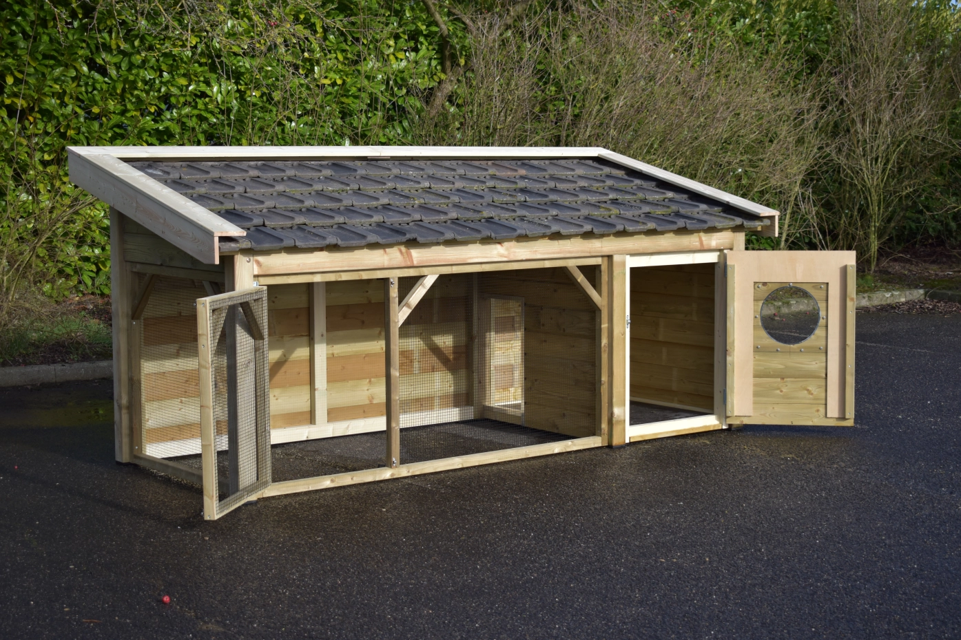 The Toby chicken coop is an exceptionally beautiful coop, made from impregnated wood and featuring a concrete plywood floor in the sleeping area. The roof is finished with traditional-style roof tiles, and the walls and overhangs are made of treated spruce wood.