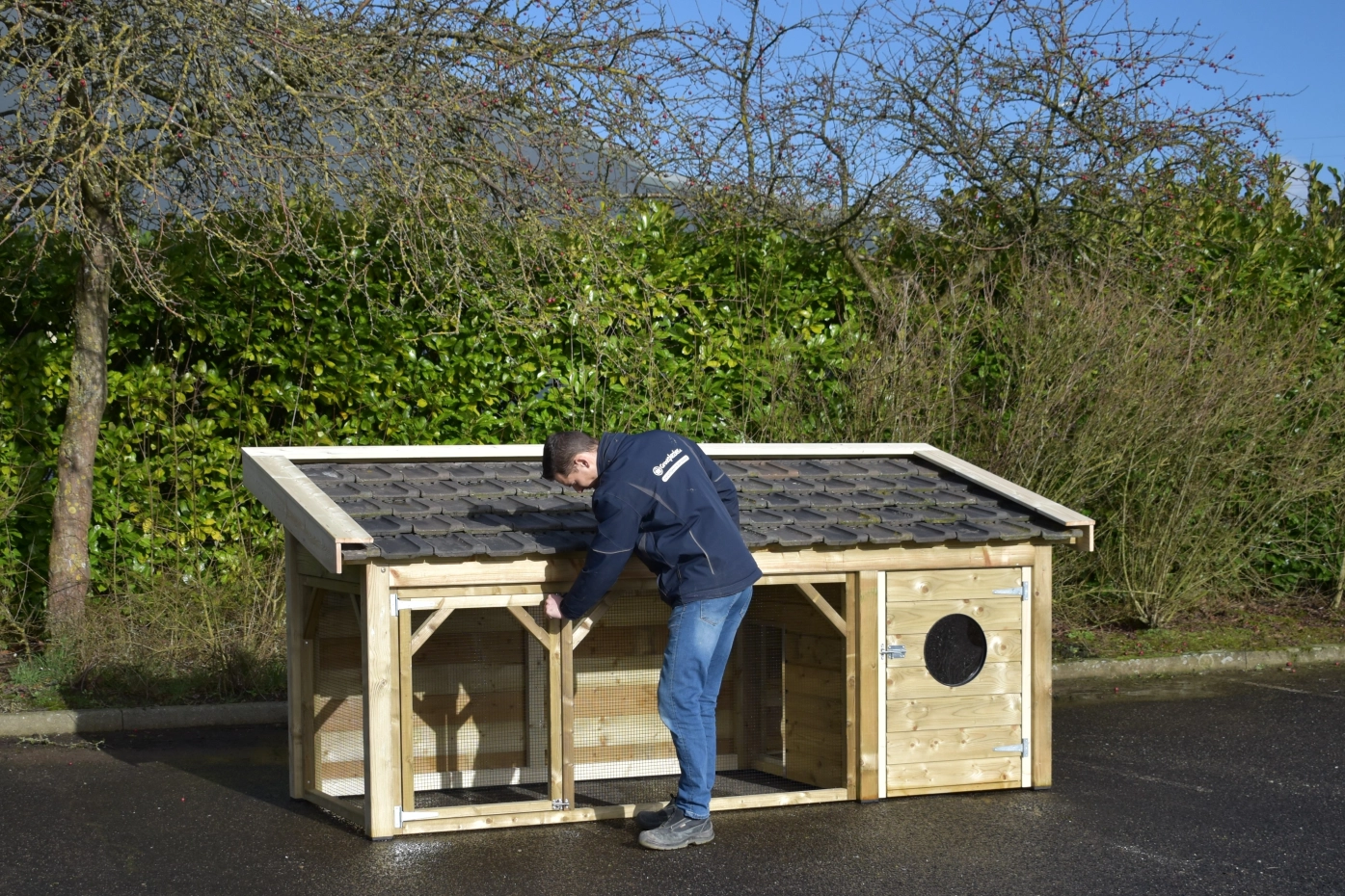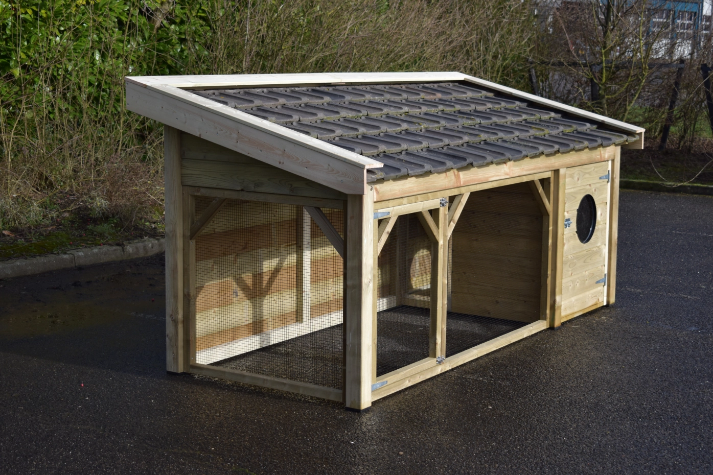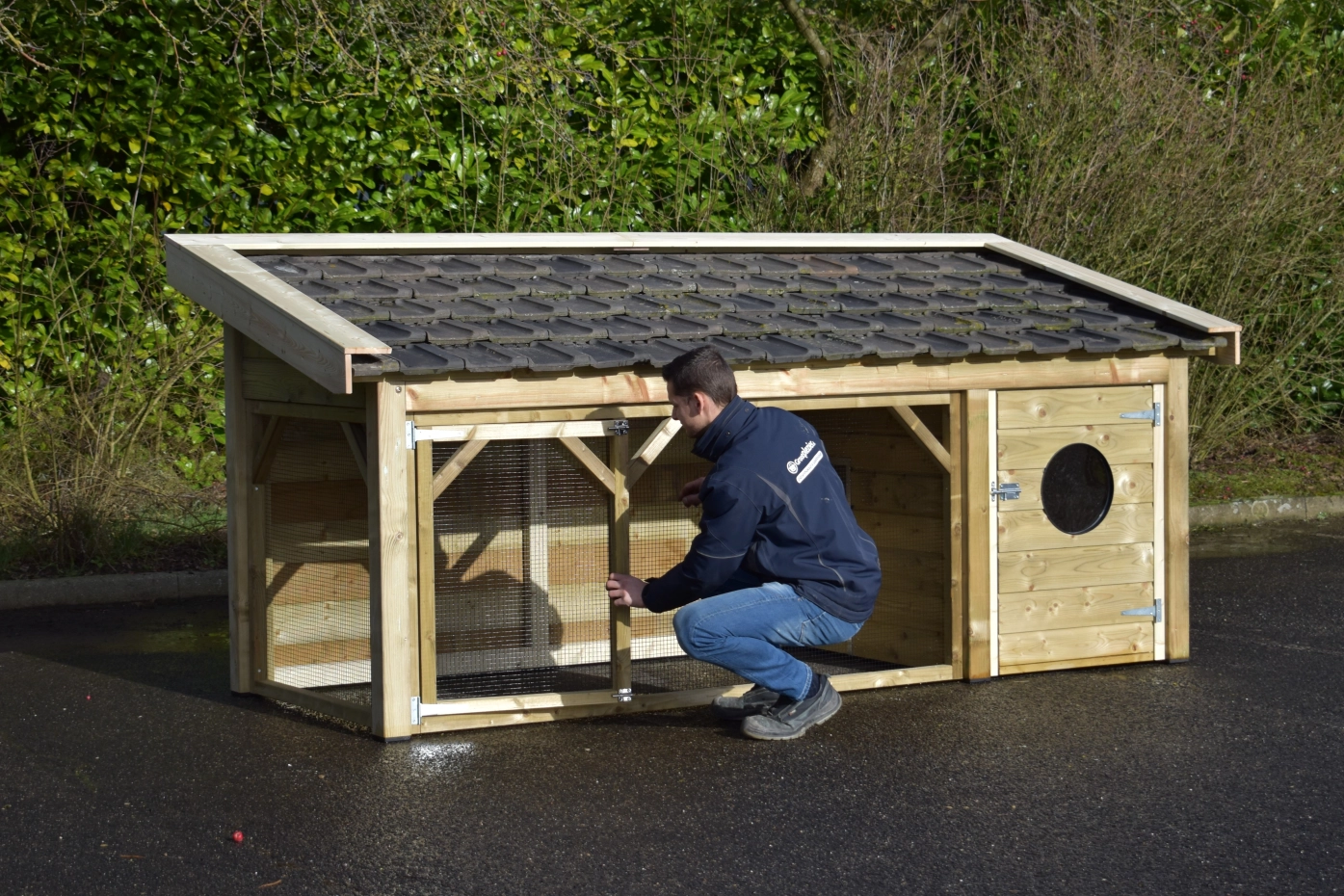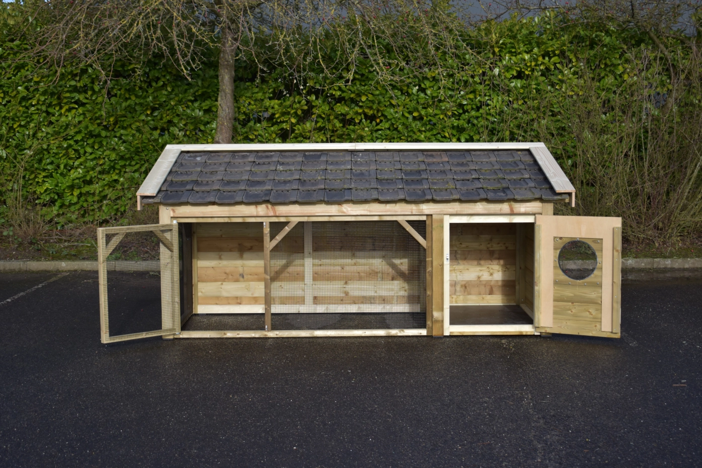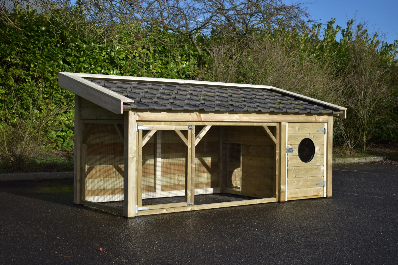 The Toby chicken coop is an exceptionally beautiful coop, made from impregnated wood and featuring a concrete plywood floor in the sleeping area. The roof is finished with traditional-style roof tiles, and the walls and overhangs are made of treated spruce wood.