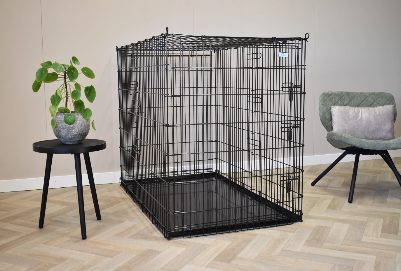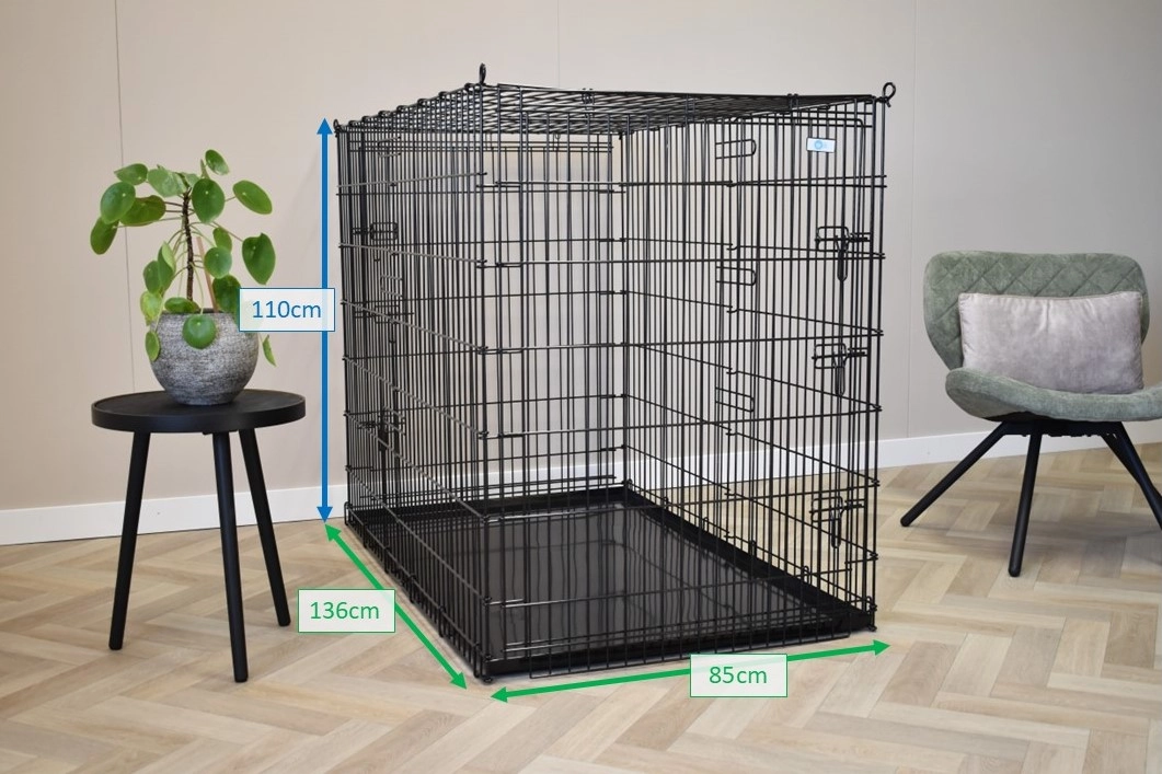 This extra large dog crate of no less than 136x85x110cm is a huge dog crate. Even the largest dog will fit in this wire cage. This large XXL dog kennel is provided with 2 doors with solid, 3-double closures.