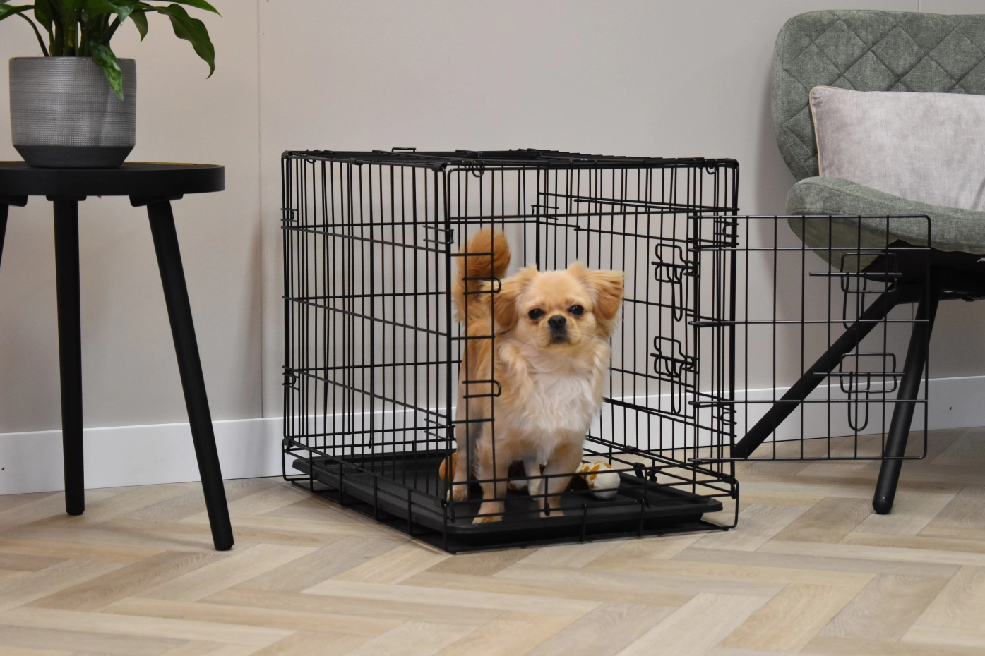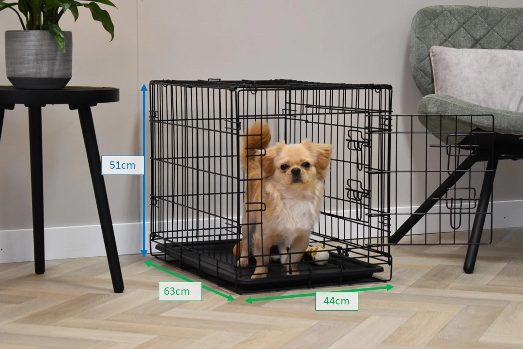 The dog crate Profit has the dimensions 63x44x51cm. The crate is provided with 2 doors with locks. The foldable crate has an plastic tray, so that you can clean the crate very easily. Suitable as a crate for a smaller dog like Boomer, Cavalier King Charles Spaniel, Pomeranian, Jack Russell, Maltese, Pekingese, Dachshund, West Highland White Terrier, and Yorkshire Terrier. The black dog crate Profit is available in 3 different sizes: [63cm] / 92cm / 122cm.