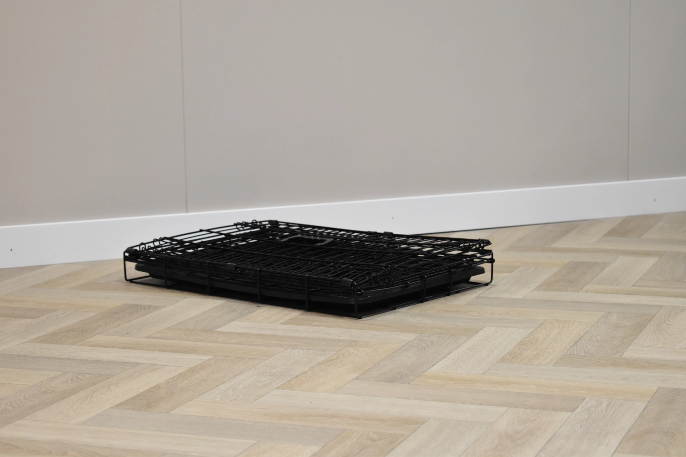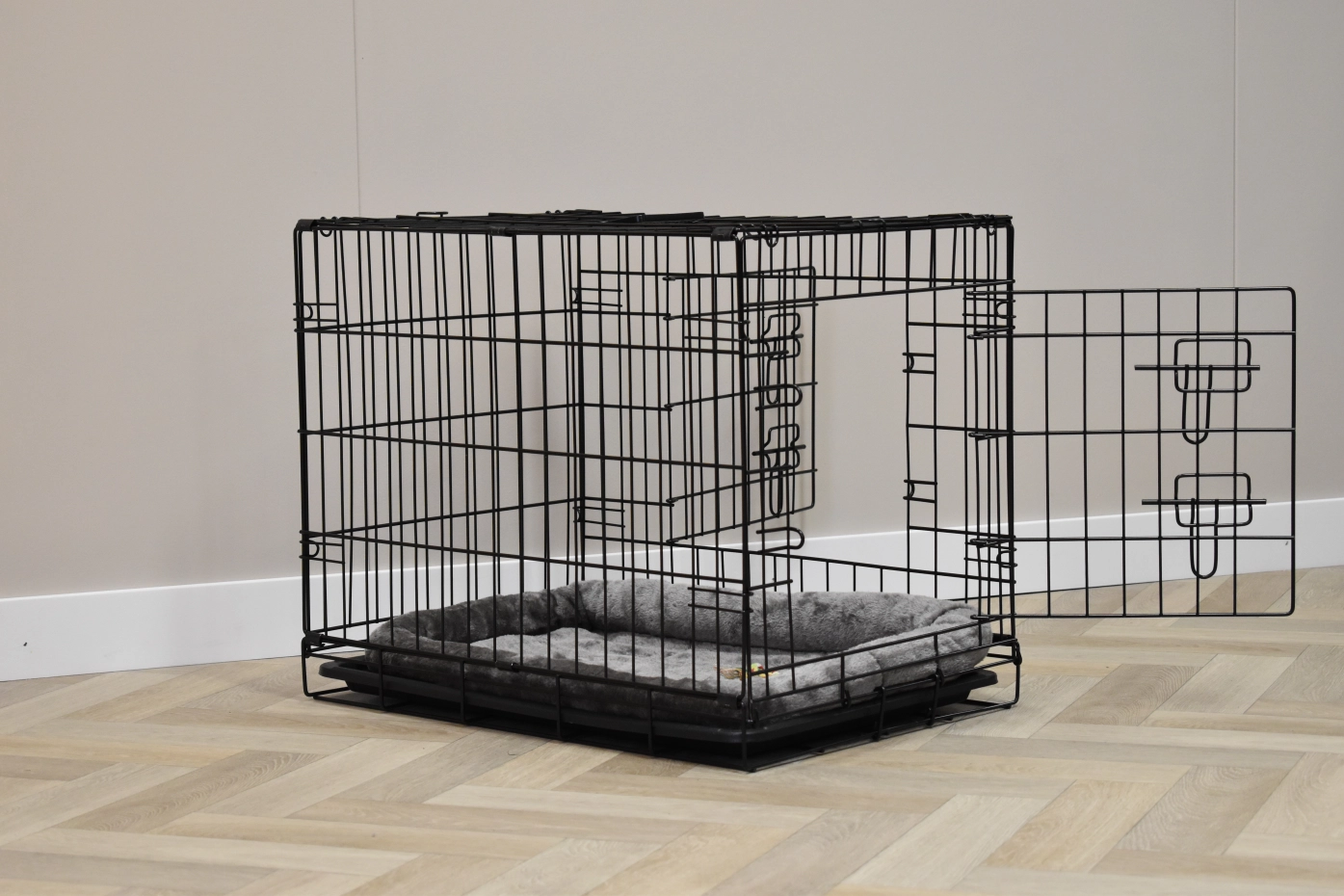 - Solid dog crate with black-coated bars