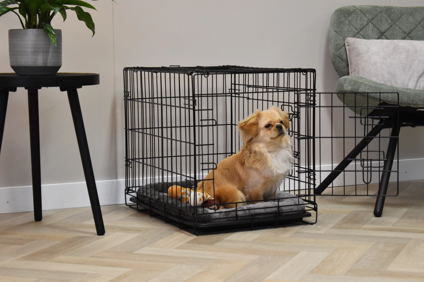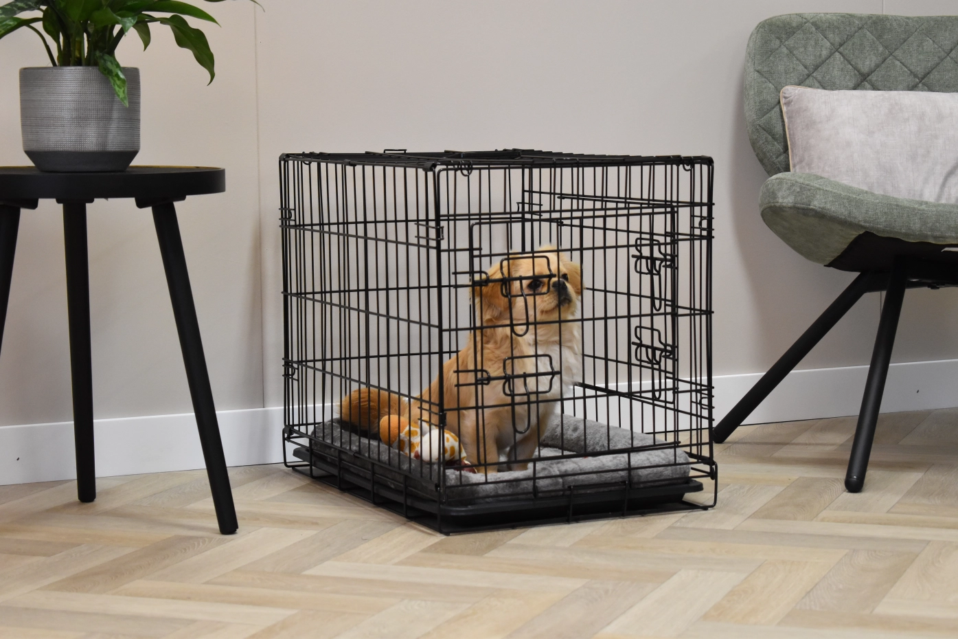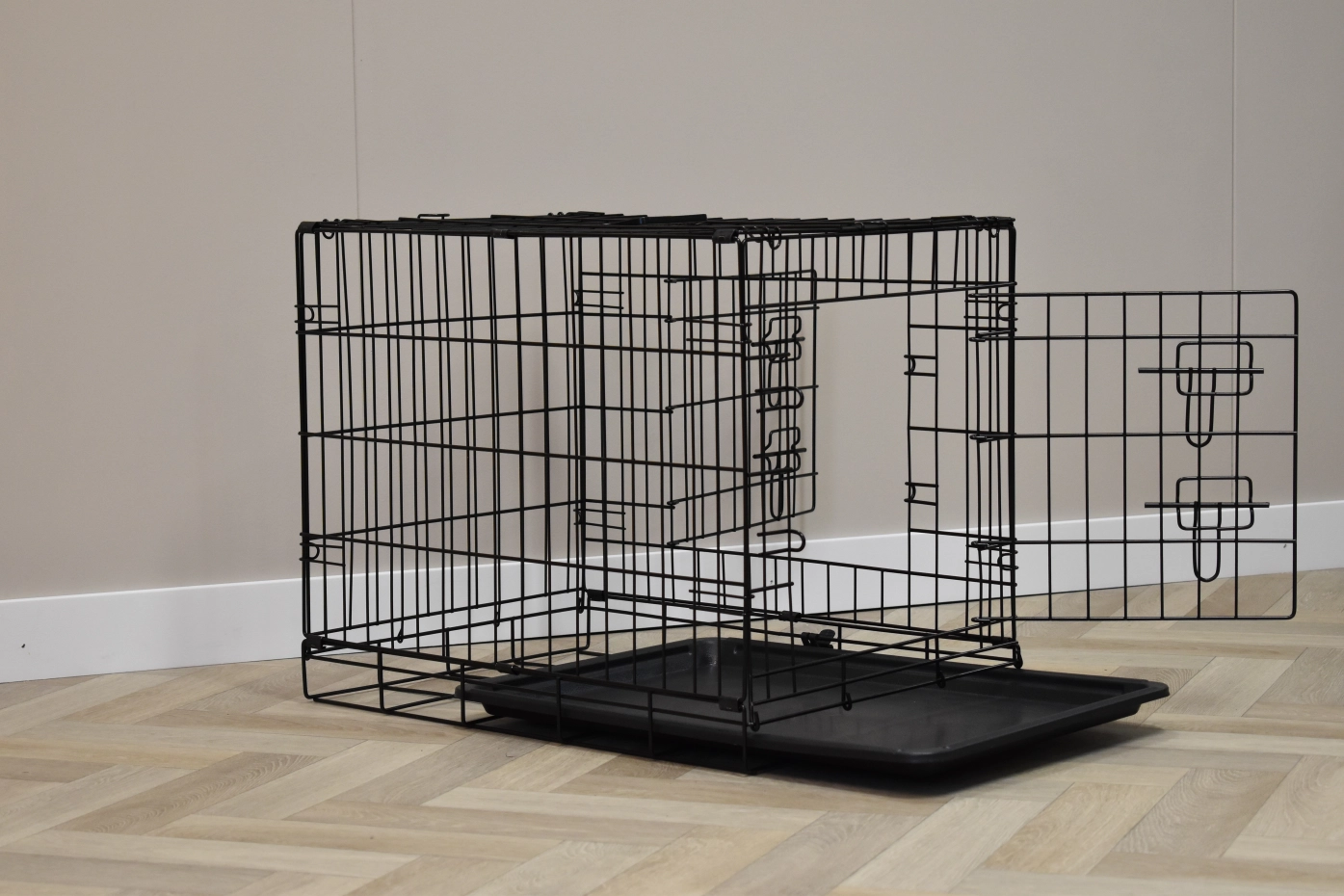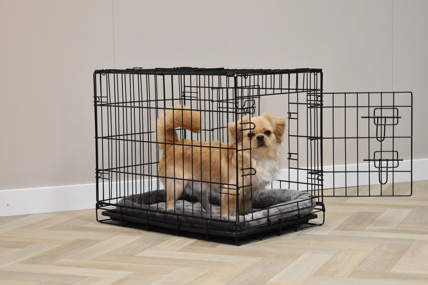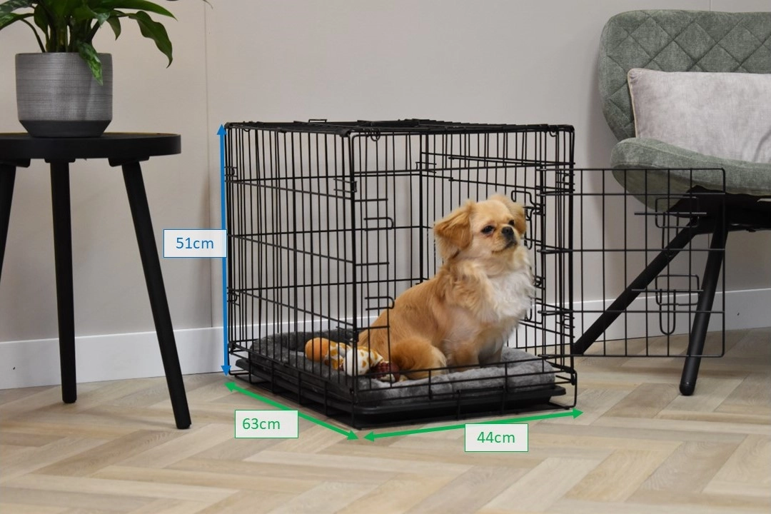 The dog crate Profit has the dimensions 63x44x51cm. The crate is provided with 2 doors with locks. The foldable crate has an plastic tray, so that you can clean the crate very easily. Suitable as a crate for a smaller dog like Boomer, Cavalier King Charles Spaniel, Pomeranian, Jack Russell, Maltese, Pekingese, Dachshund, West Highland White Terrier, and Yorkshire Terrier. The black dog crate Profit is available in 3 different sizes: [63cm] / 92cm / 122cm.