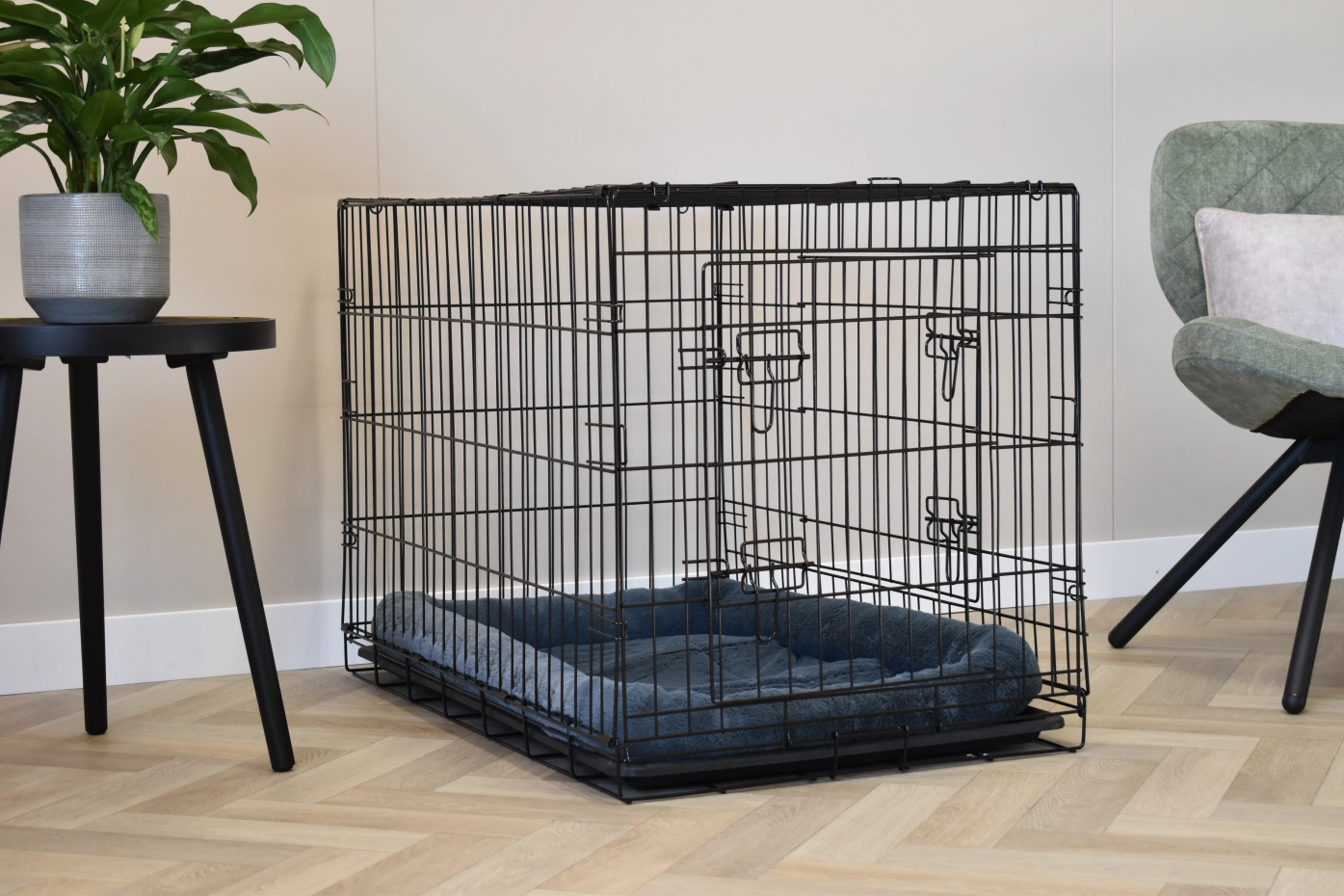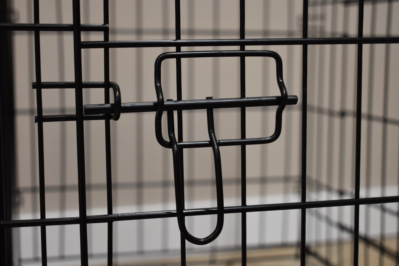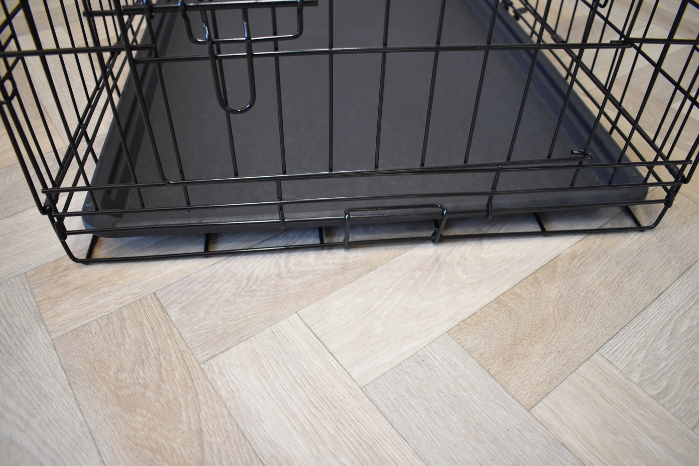 - Solid dog crate with black-coated bars