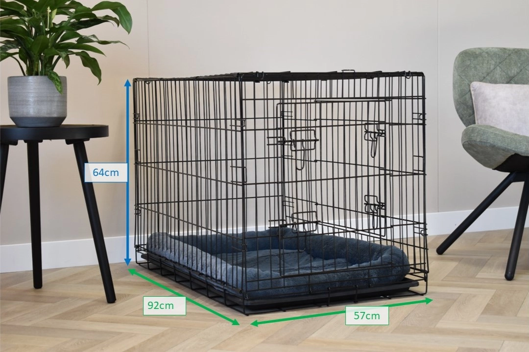 The dog crate Profit has dimensions 92x57x64cm. The dog crate is provided with 2 doors with locks. The foldable dog crate has a removable plastic tray, so that the crate can be cleaned very easily. Our crate is often used for dogs as well for cats. Bench for medium-sized dogs, intended for dogs like: American Staffordshire Terrier, Bulldog, Chow Chow, Cocker Spaniel, English Setter, English Springer Spaniel, Labradoodle, Pit Bull Terrier, Samoyed, and Siberian Husky. The black crate is available in 3 diversal sizes: 63cm / [92cm] / 122cm.