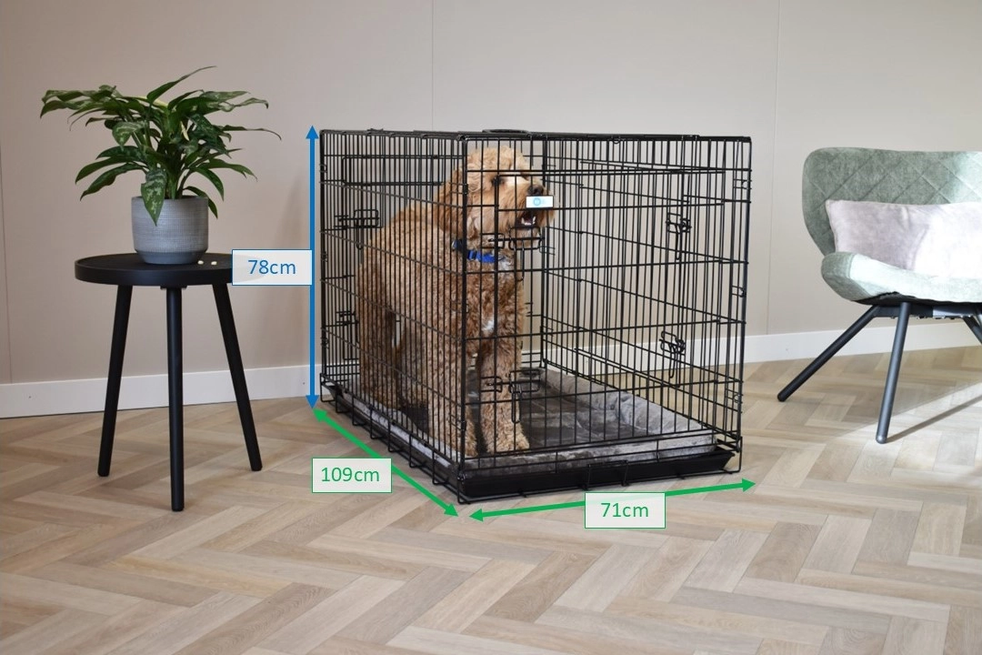 - The dog cage is easy to fold and therefore very compact to transport. It is even equipped with a handle