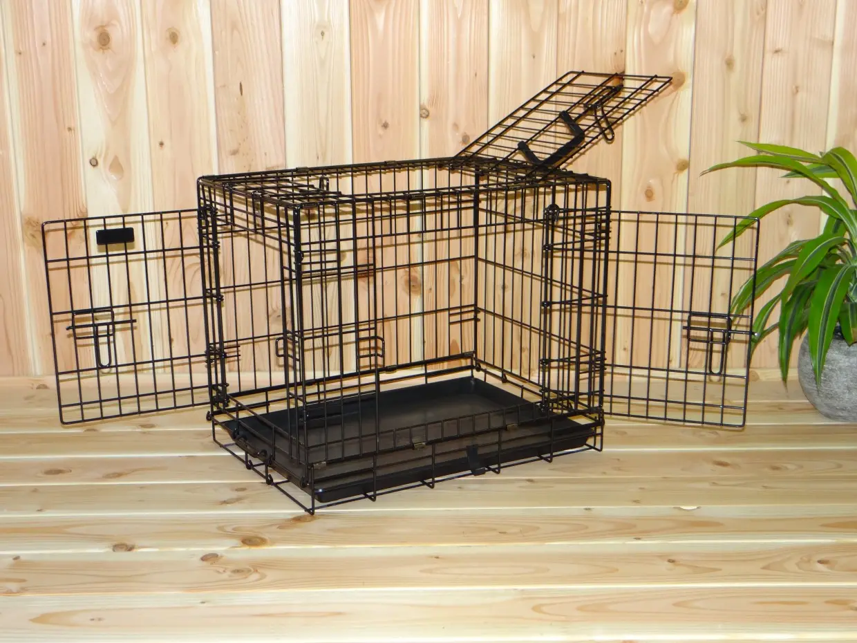 Sturdy, black dog crate with 3 doors. The dimensions of this dog crate are 63x45x52cm. This wire cage with sturdy, thick, black powder-coated bars has 3 sturdy doors with special slide locks. A convenient, foldable dog crate equipped with rubber anti-slip feet and a removable plastic tray. Suitable as a crate for smaller dogs like Boomer, Cavalier King Charles Spaniel, Pomeranian, Maltese, Pekingese, Dachshund, West Highland White Terrier, and Yorkshire Terrier. Our strong, black dog crate is available in 7 different sizes: 48cm / [63cm] / 78cm / 93cm / 109cm / 124cm / 136cm.