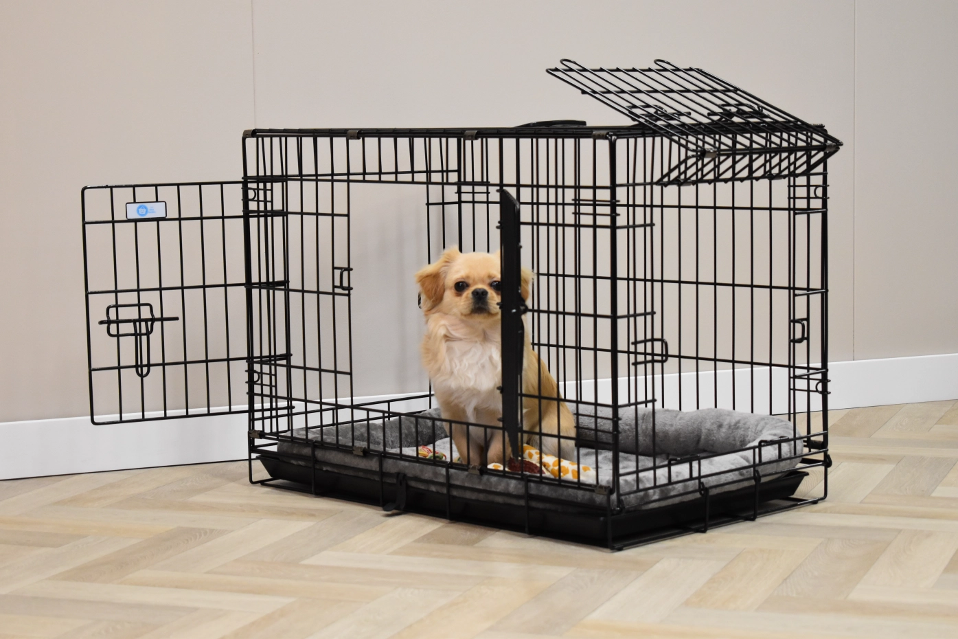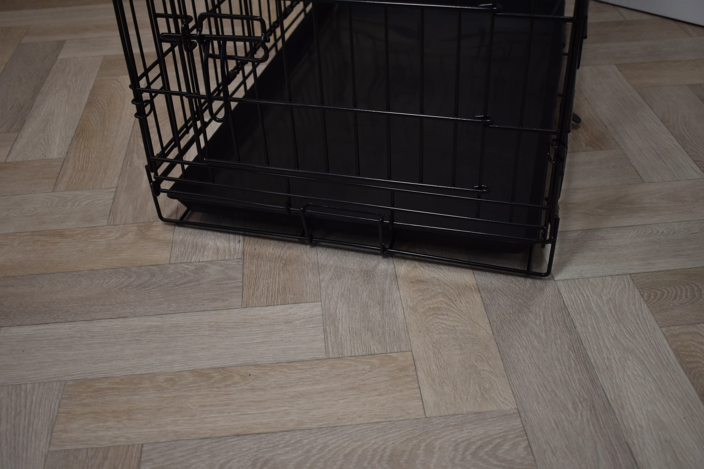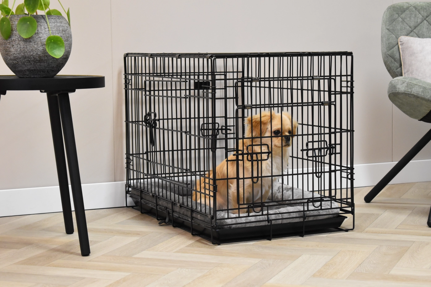 Sturdy 78x49cm Dog Bench. Our dog kennel with sturdy, thick, black powder-coated bars features 3 sturdy doors with sliding/folding closure. This handy, foldable dog kennel is also equipped with rubber non-slip feet. The dog kennel also has a removable plastic tray. This crate is intended for somewhat smaller dog breeds: Beagle, Miniature Schnauzer, French Bulldog, Pomsky, Welsh Springer Spaniel, and Whippet.