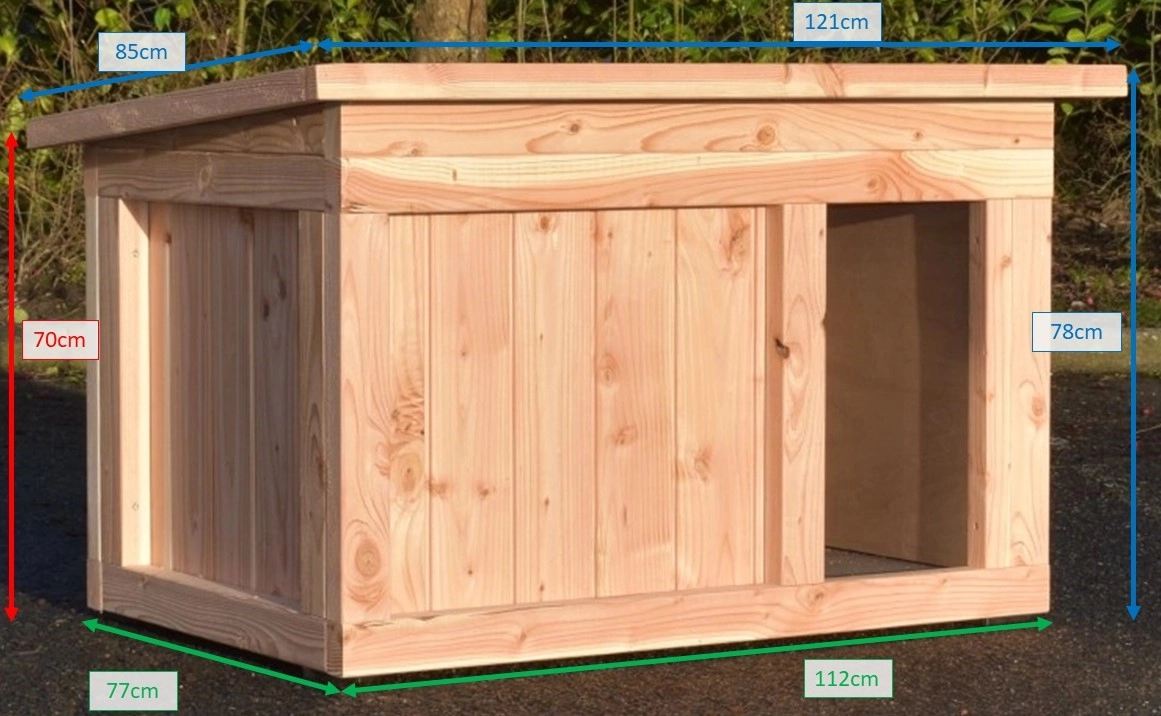 Dog house Block Medium is made of Douglaswood. This hutch is very durable. The interior is provided with insulation sheets of 3,5cm thick. Under the floor are also insulation plates. Your dog can stay outside during the whole year. This hutch is suitable for little till medium sized dogs, such as a Keeshond, Beagle, and Schnauzer. This dog house is also available in bigger sizes.