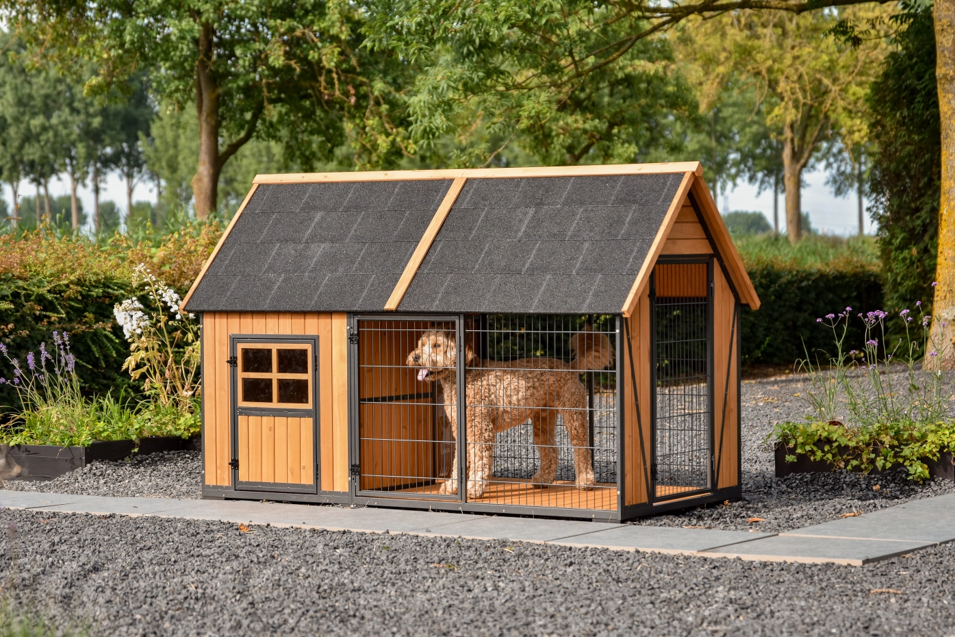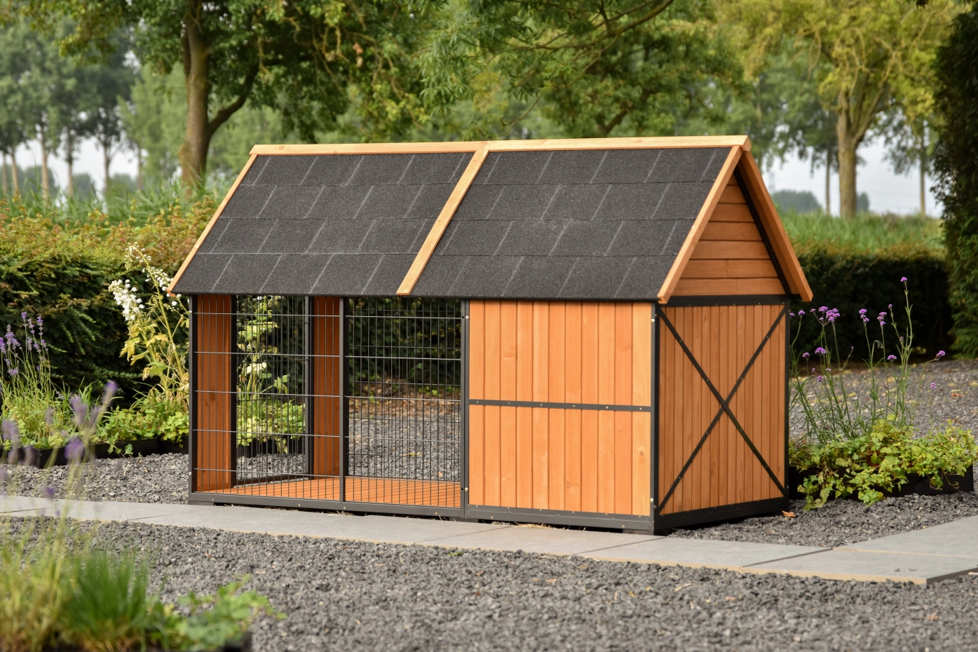 With its distinctive gabled roof, three access doors, and wooden floor, this doghouse is not only practical but also user-friendly. The spacious sleeping area offers shelter and comfort, while the attached run provides enough space to lie down, move around, and enjoy the fresh air. This kennel is suitable for small to medium-sized dogs – a comfortable home for your loyal four-legged friend!