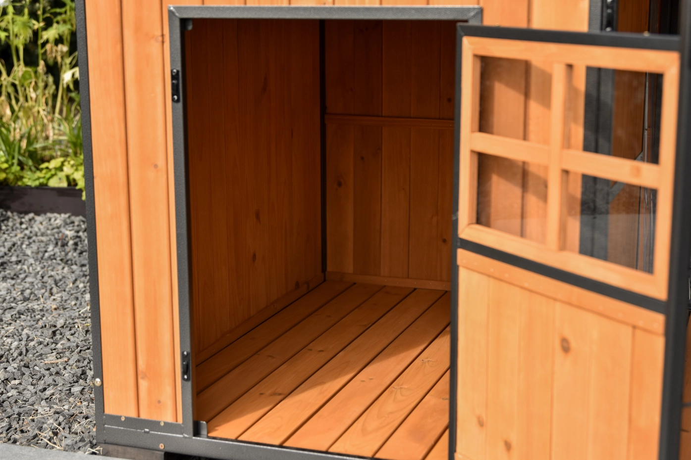 - Animal hutch made of pine wood with a sturdy, coated steel frame and black wire mesh