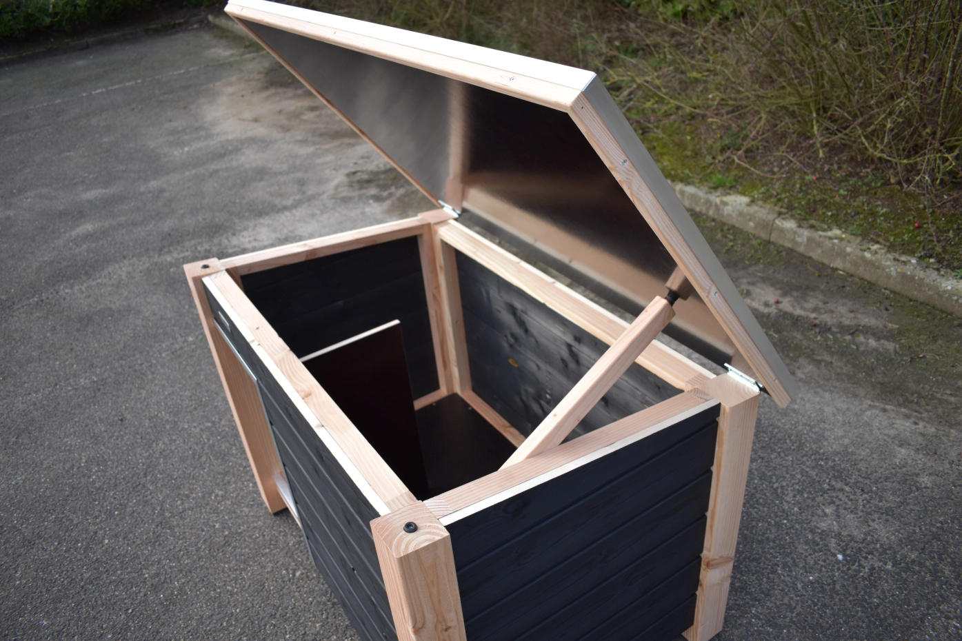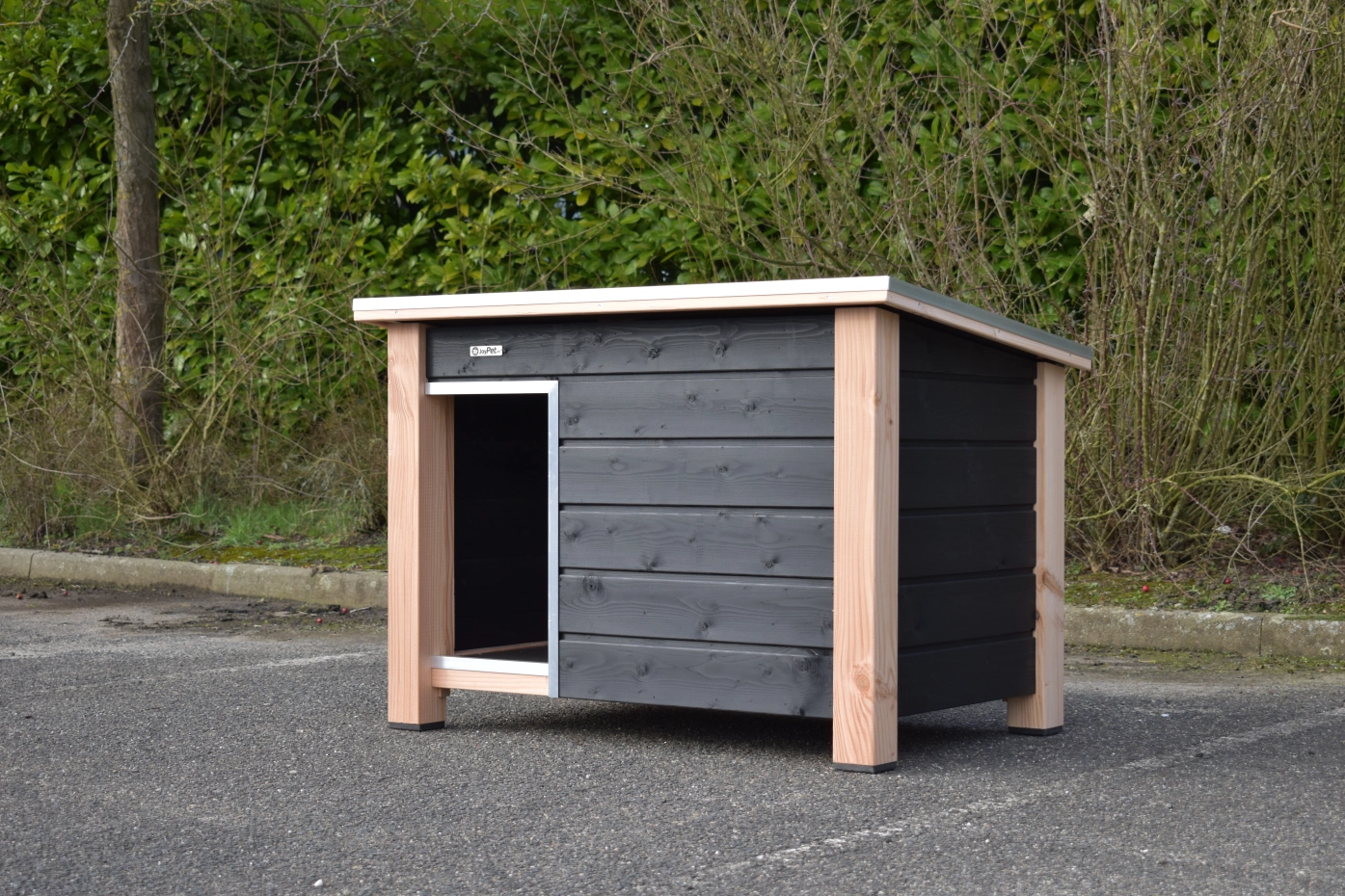 Dog house Ferro has legs of Douglas wood. The walls are made of impregnated wood and are painted black. The house has a practical hinged roof. The dog house Ferro is suitable for dogs, such as a Beagle, Border Collie, English Bulldog, Friesian Stabby, Keeshond, Labradoodle and Pomsky.