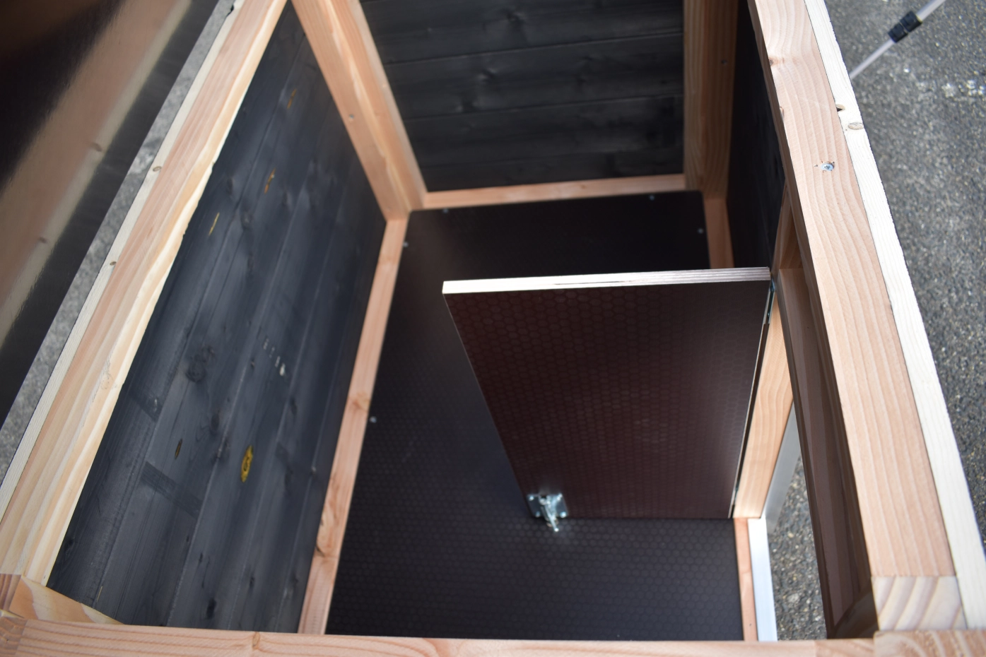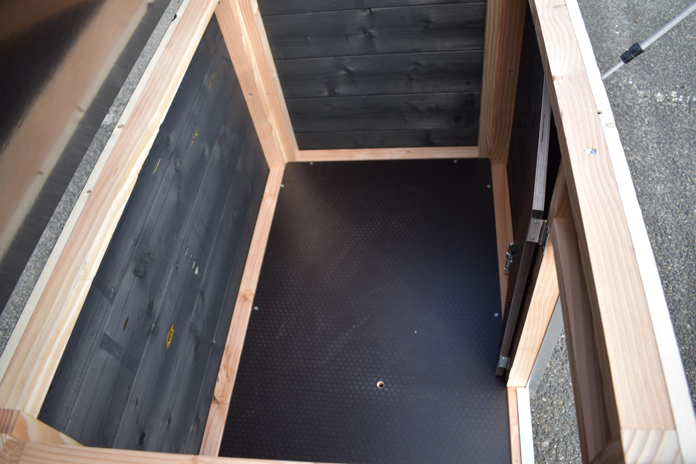 - The doghouse is equipped with a windwall, which can be pushed against the wall as well