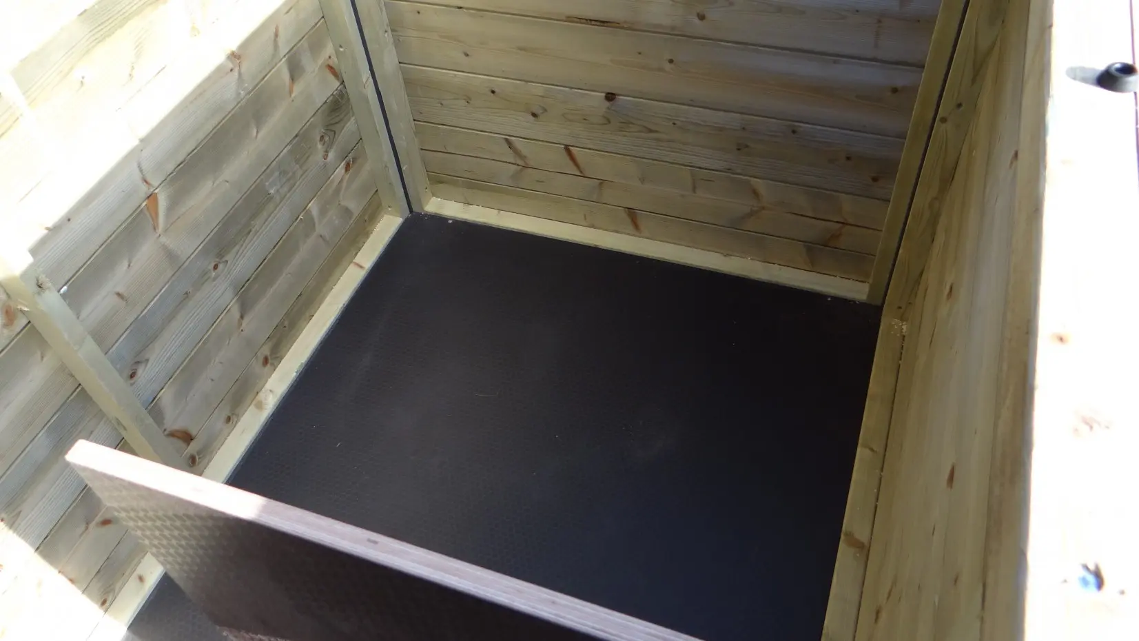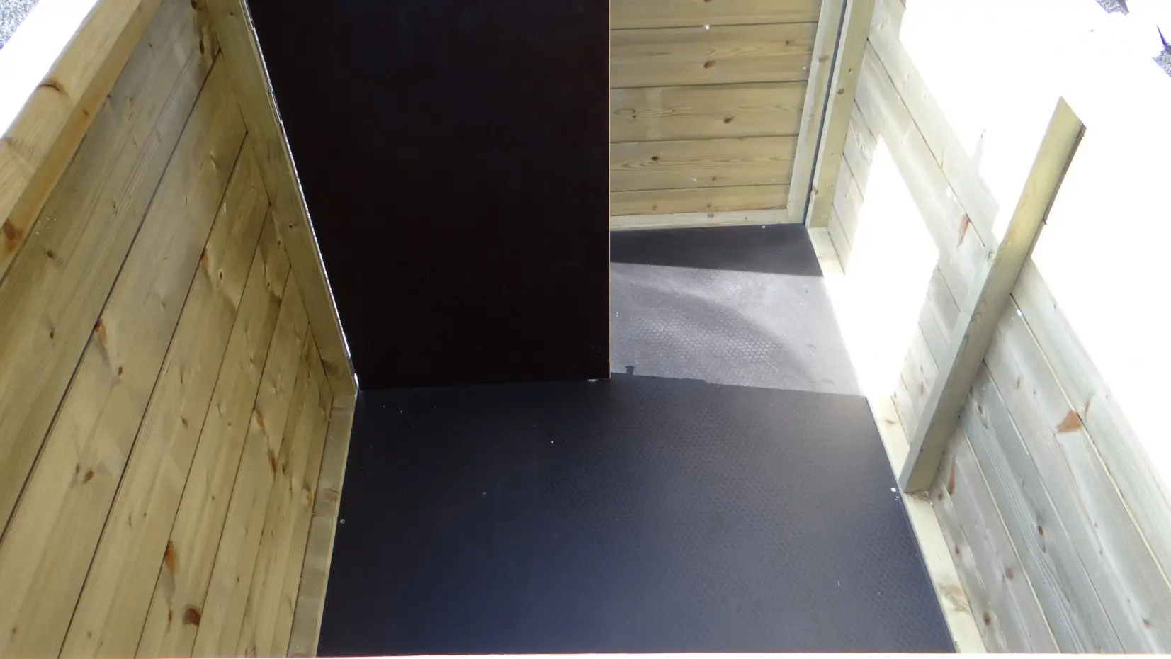 - The doghouse is equipped with a windwall, which can be pushed against the wall as well