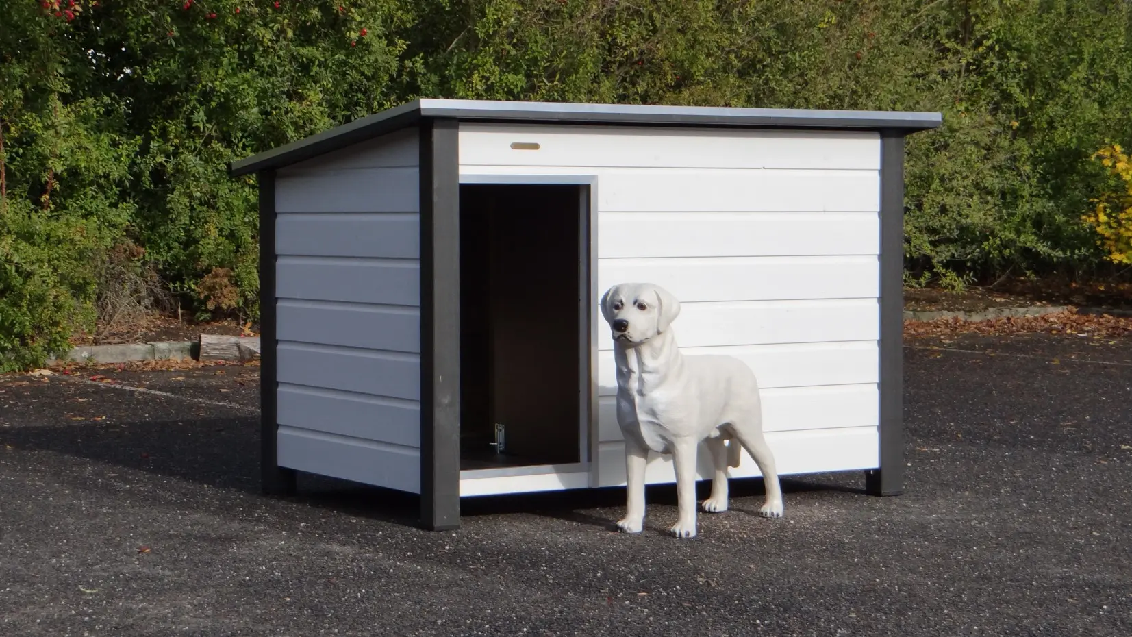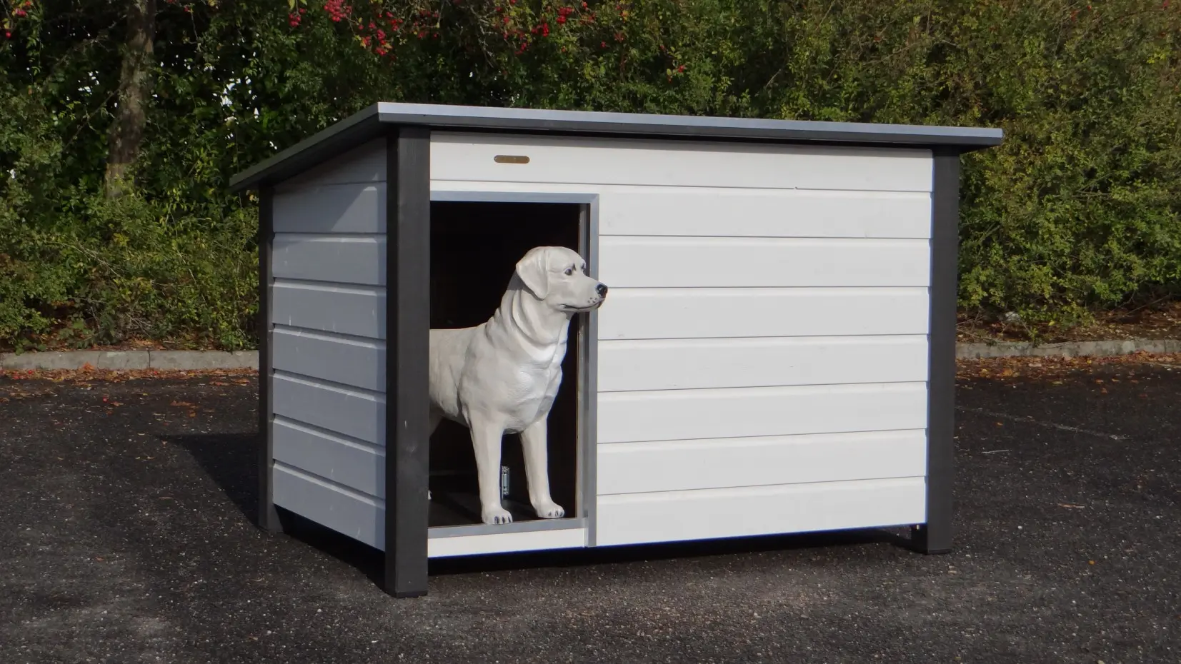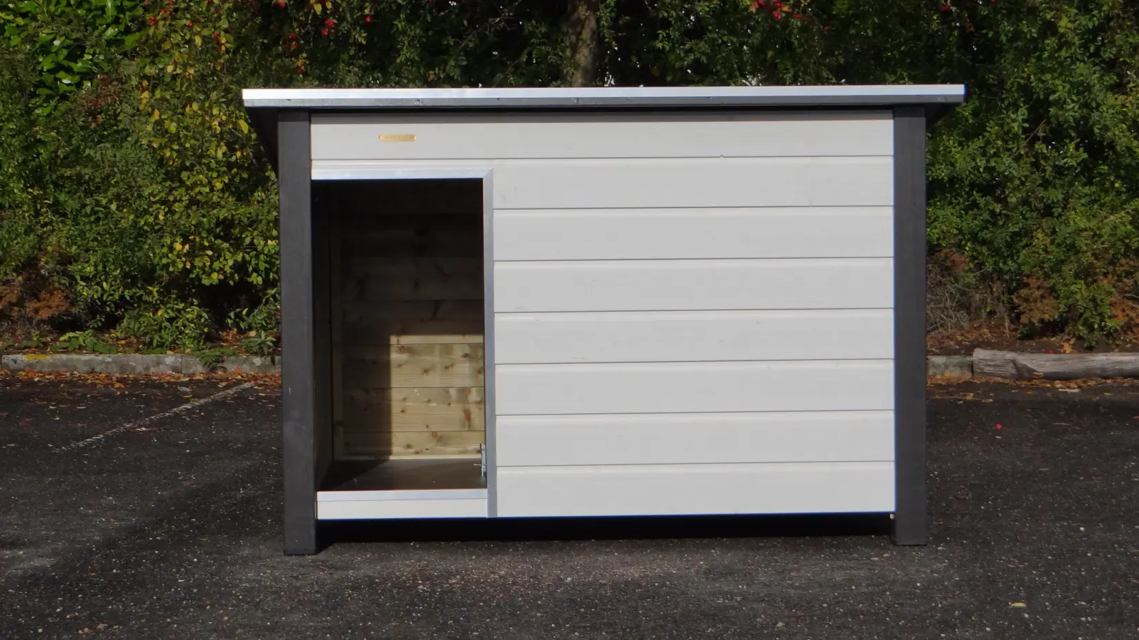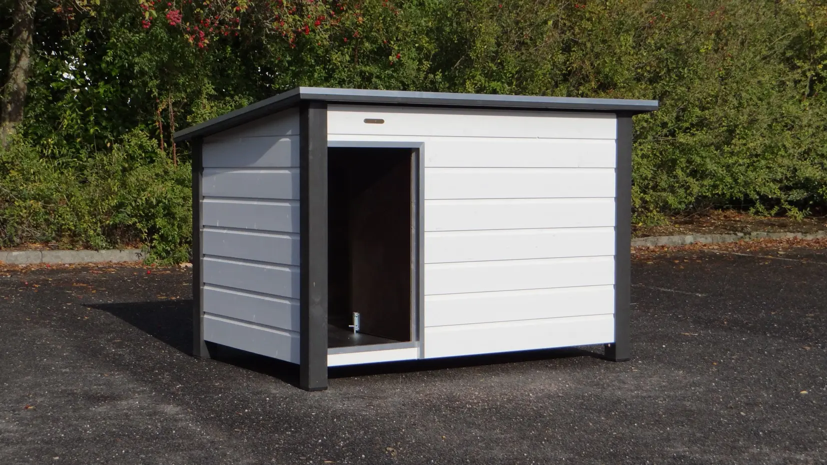 Looking for a large and sturdy dog house? The Loebas White-Grey offers quality, durability, and convenience. Dimensions: 185×125×122 cm — perfect for large breeds such as Great Dane, Leonberger, Danish Dog, Bernese Mountain Dog, and Saint Bernard. The flat hexagrip plywood roof with aluminum edges and anti-slip surface opens for easy access. The floor is also made of hexagrip plywood with a non-slip layer. Includes a draft partition and aluminum-trimmed entrance. Also available in an insulated version.