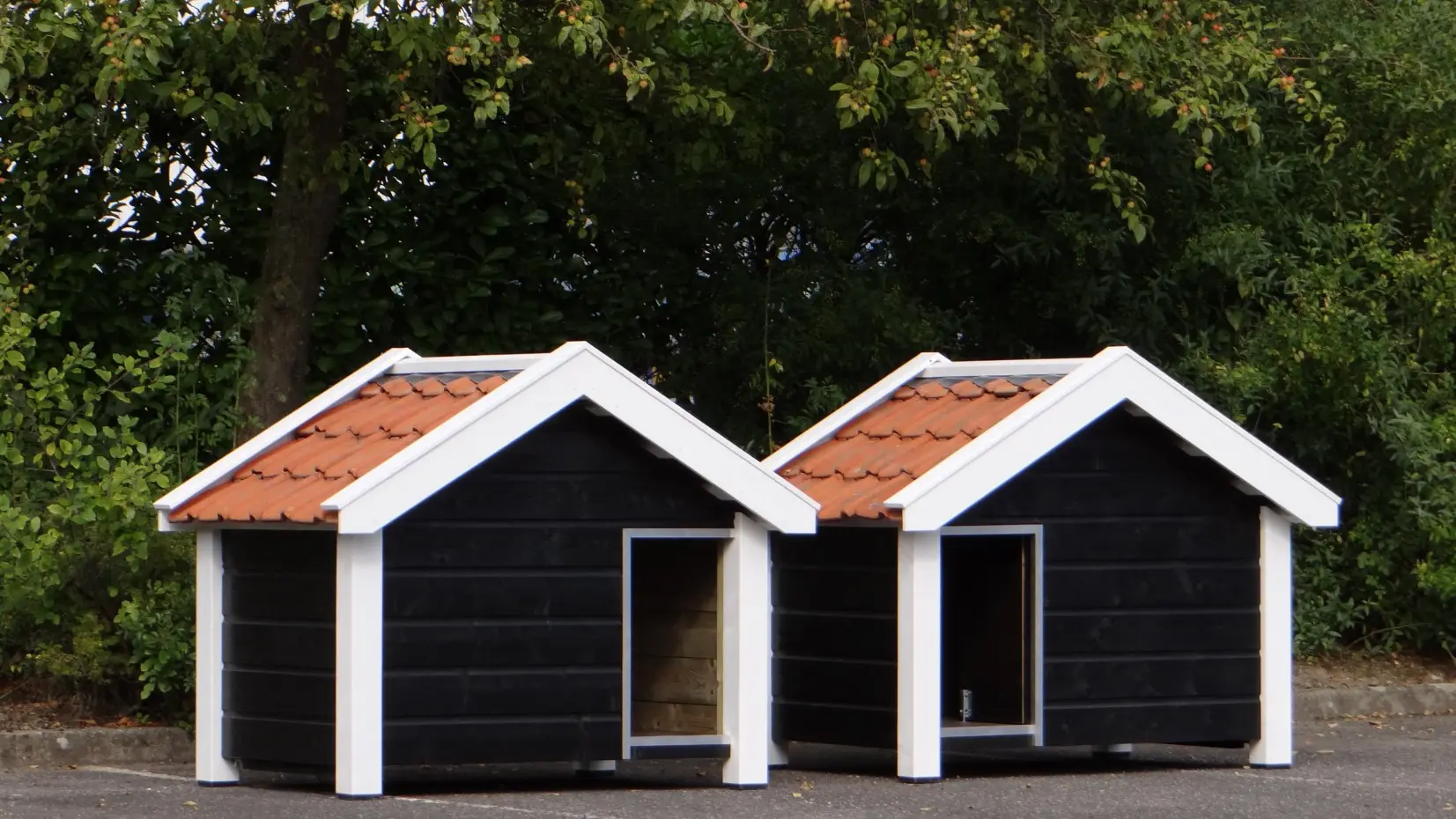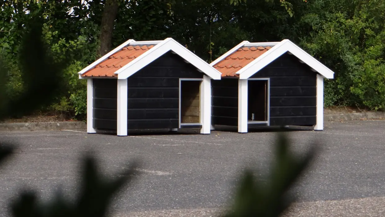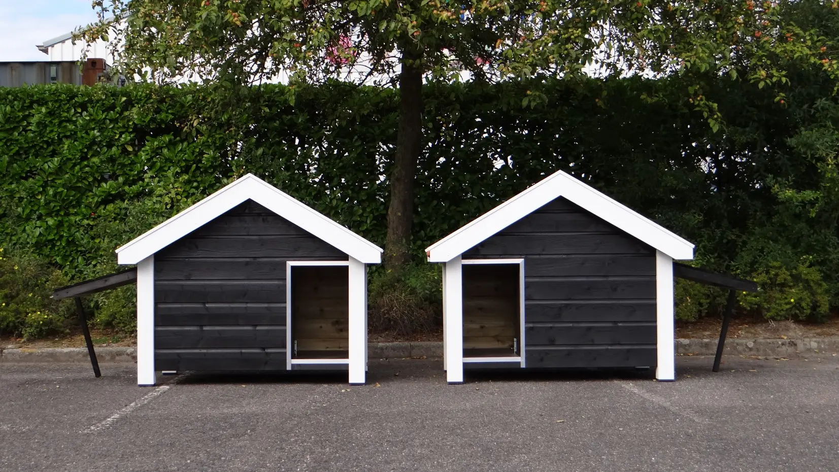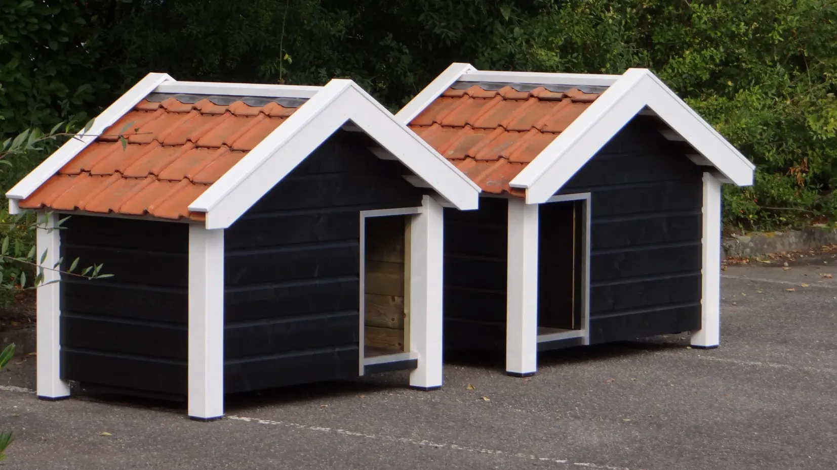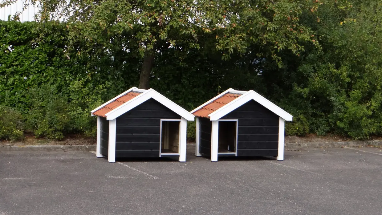 Two Reno model dog houses were custom-built in mirrored design, made from impregnated wood, painted black and white, and finished with orange roof tiles. These top-quality kennels are handcrafted by our own carpenters — combining strength, design, durability, and ease of use. The floor is made of 15 mm thick hexagrip plywood with a hard anti-slip layer, and the entrance is reinforced with sturdy aluminum to prevent damage. The houses can easily be expanded with a matching front deck. Suitable for German Shepherds, Golden Retrievers, and Labradors.