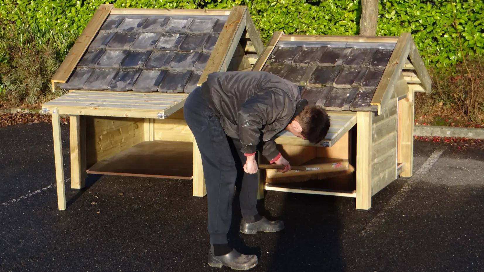 - The doghouse is equipped with a windwall, which can be pushed against the wall as well