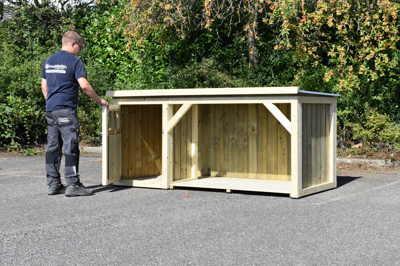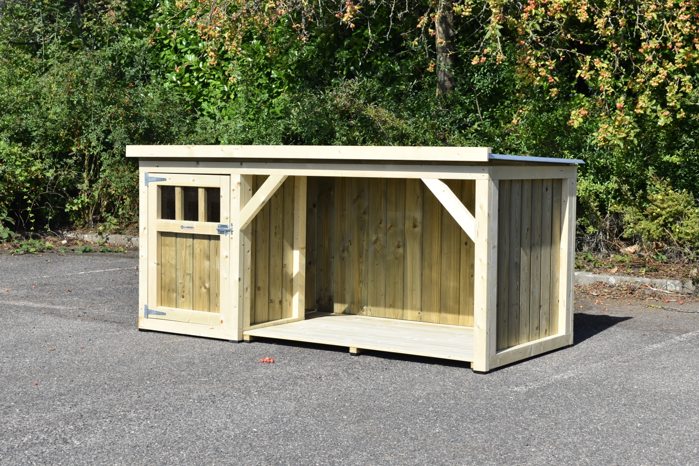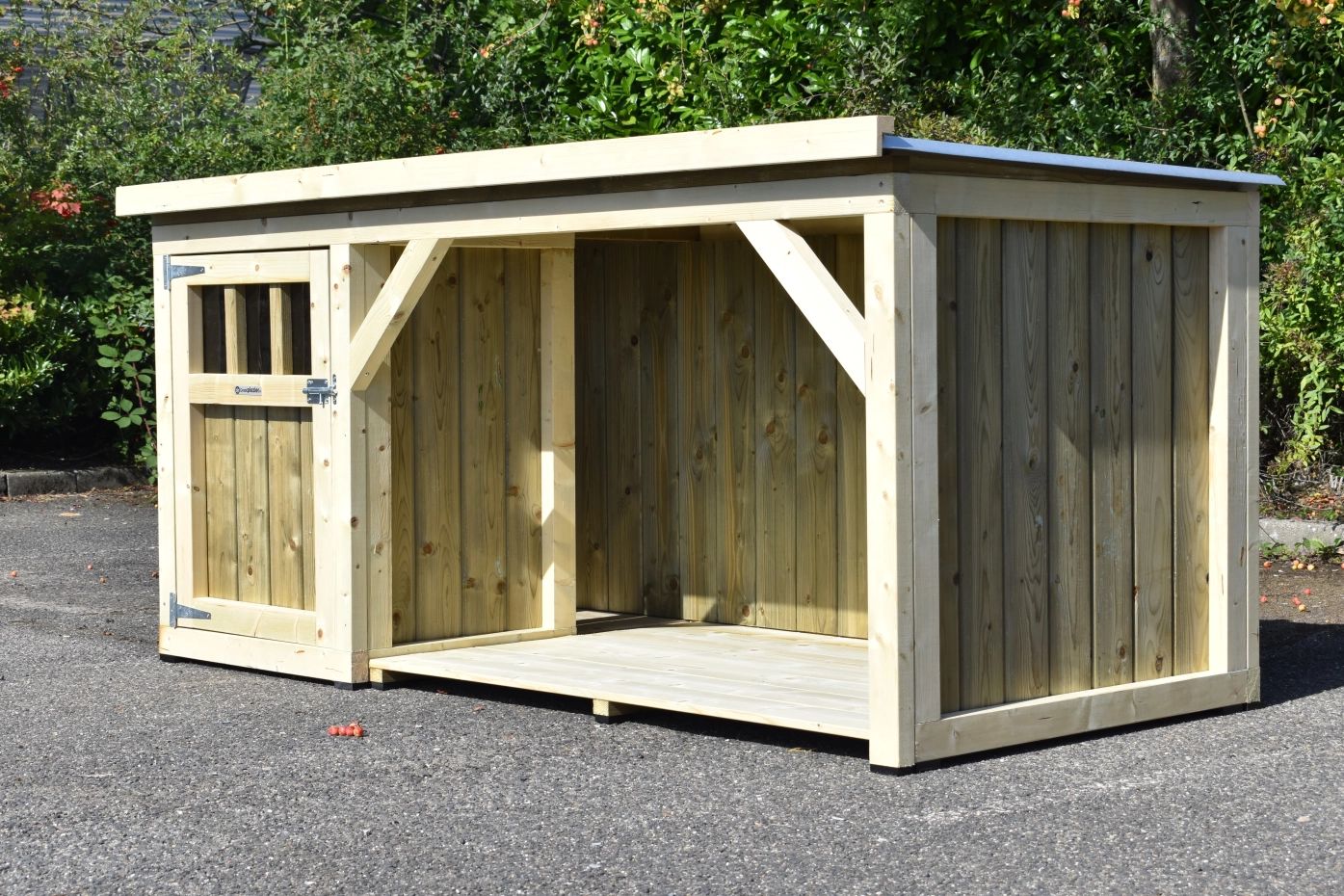 Dog house Isa 1 has a covered veranda. This house is suitable for medium till large dogs. The sleeping compartment has a wooden floor and a large door. The veranda offers a shelter for your dog. You can also order a floor for the veranda. We will produce the house in pressure-treated spruce.