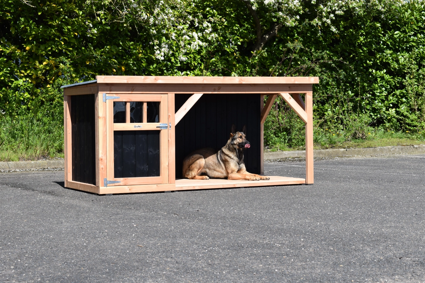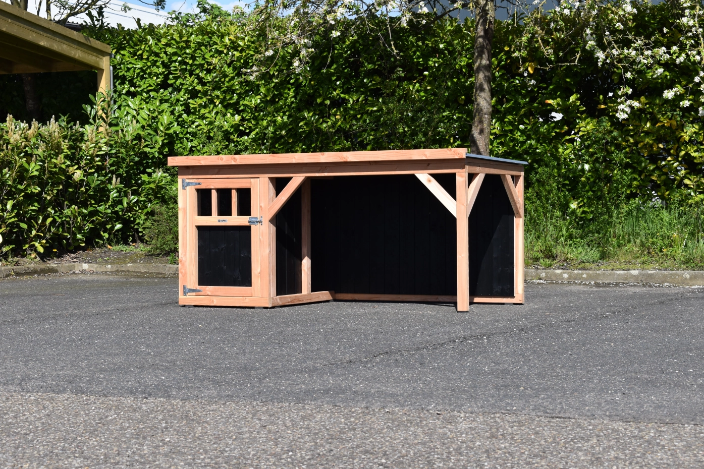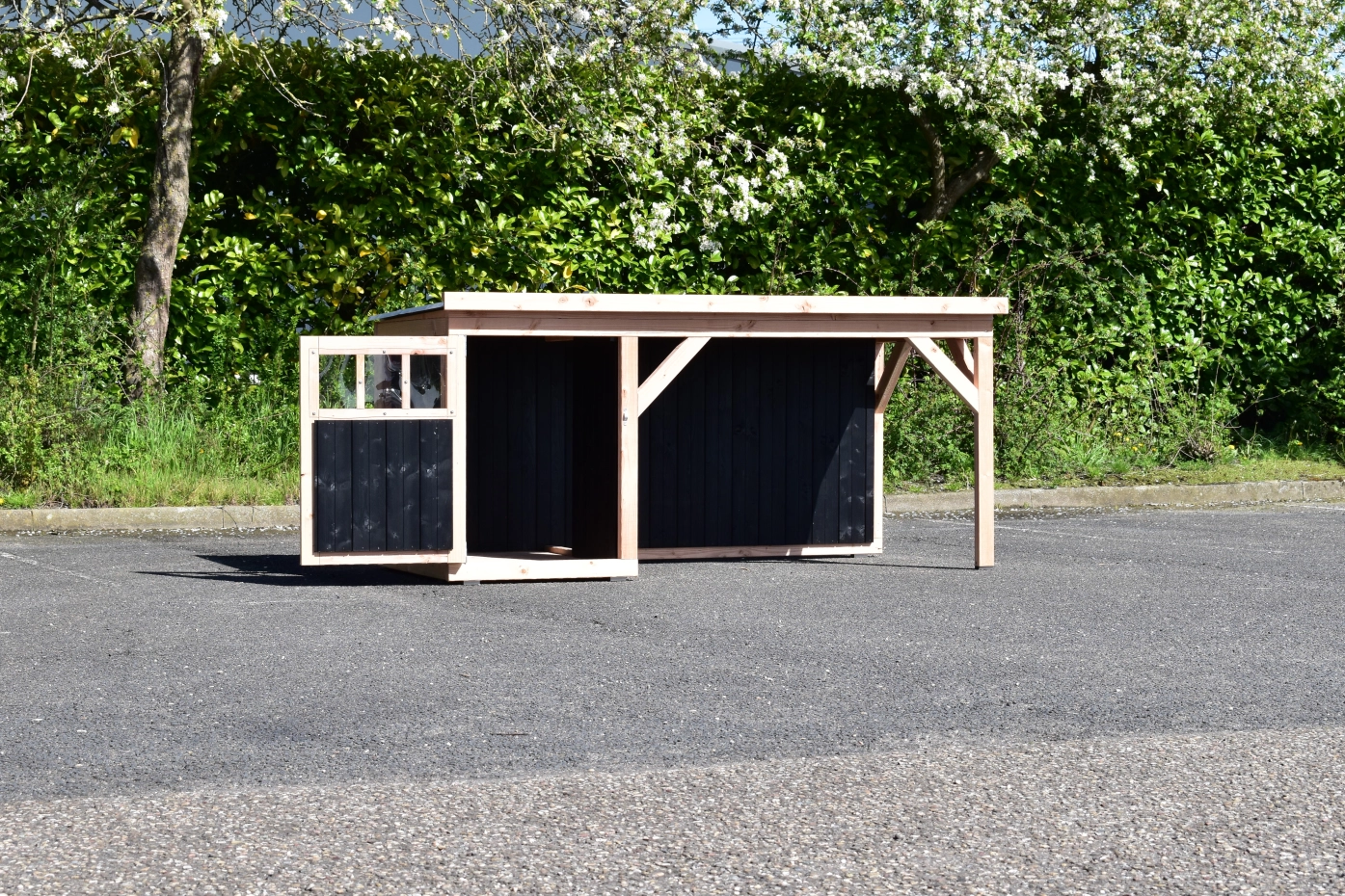 Dog house Isa 2 has a covered veranda. This house is suitable for medium till large dogs. The sleeping compartment has a wooden floor and a large door. The veranda offers a shelter for your dog. You can also order a floor for the veranda. We will produce the house in black impregnated woodand douglaswood.