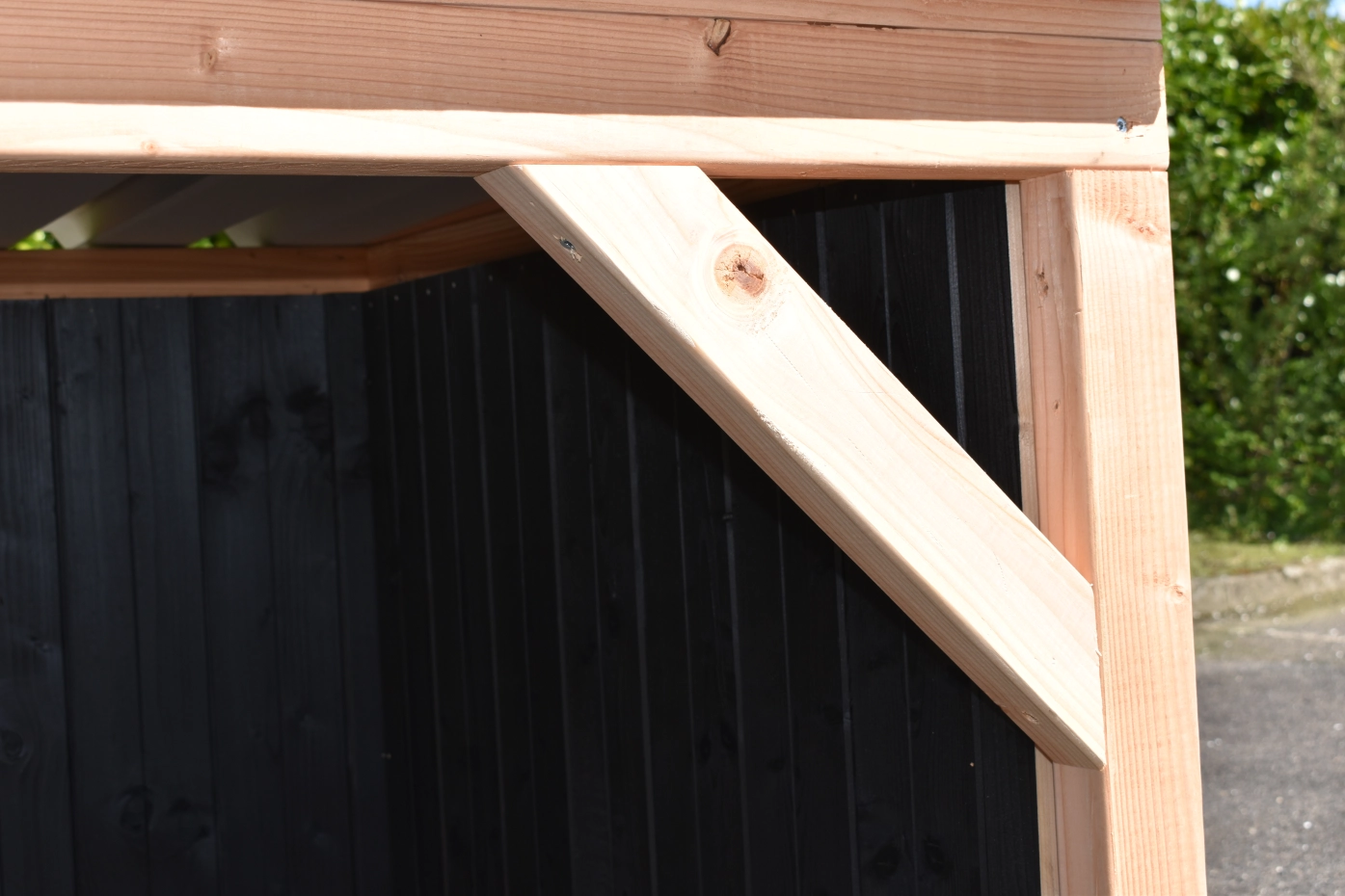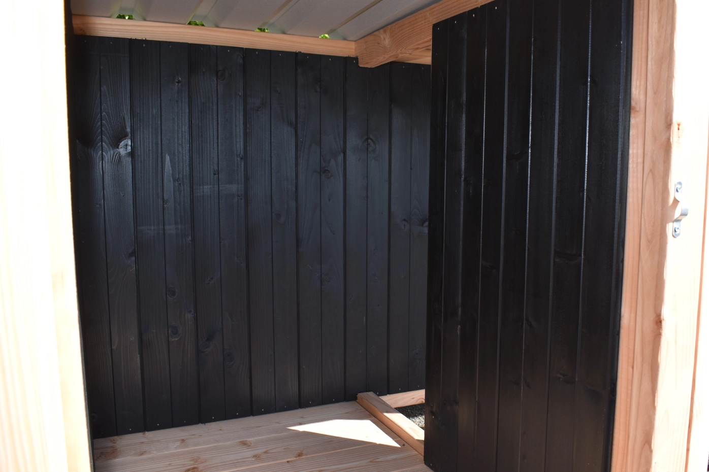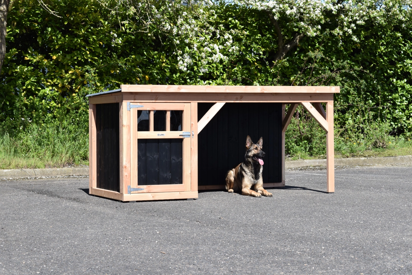 Dog house Isa 2 has a covered veranda. This house is suitable for medium till large dogs. The sleeping compartment has a wooden floor and a large door. The veranda offers a shelter for your dog. You can also order a floor for the veranda. We will produce the house in black impregnated woodand douglaswood.