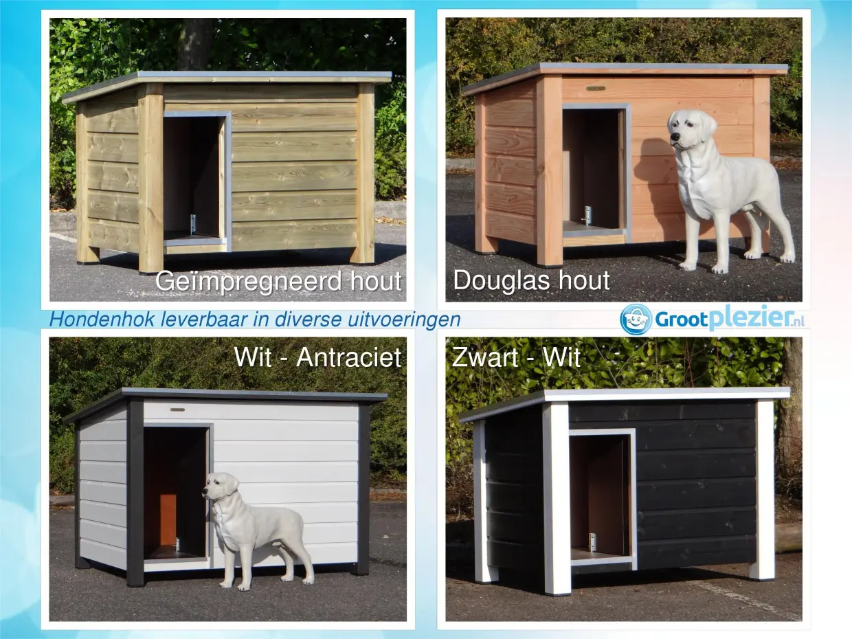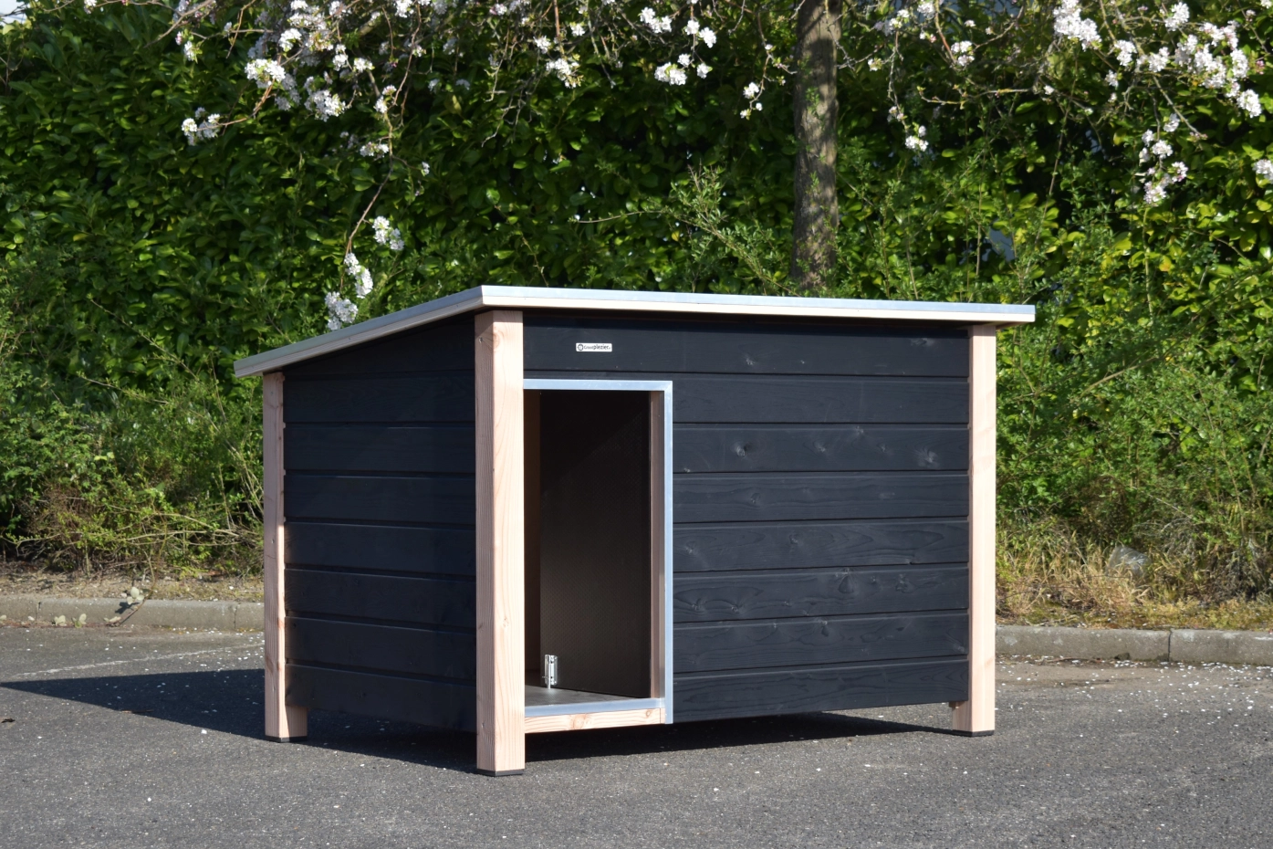 Want to buy a large dog house? This dog house Loebas is suitable for large dogs, such as Great Dane, Leonberger, Bernese and Bernhardt. The opening is provided with chewprotection. In the house is a hinged windwall, which offers your dog a shelter. The roof is made of plywood and is provided with aluminium chewprotection, so that your dog can lay on the roof. The floor is also made of plywood.