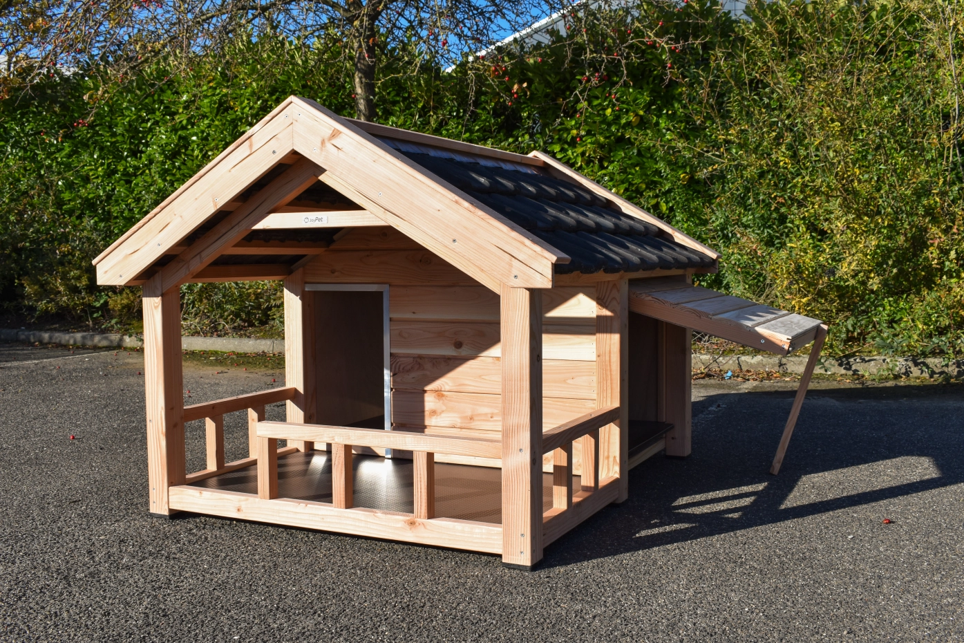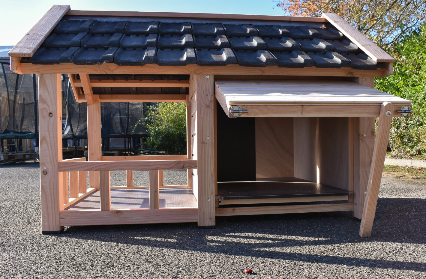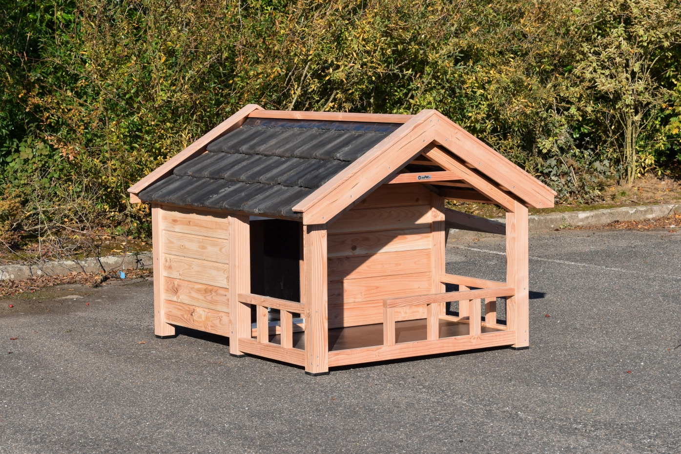 Dog house Reno is an insulated dog house with Veranda, made of Douglaswood. The house is provided with second-hand tiles. The walls are 7cm thick. The house is suitable for dogs, such as Golden Retriever, Dutch Shepherd, Labrador Retriever. Top quality for your friend!
