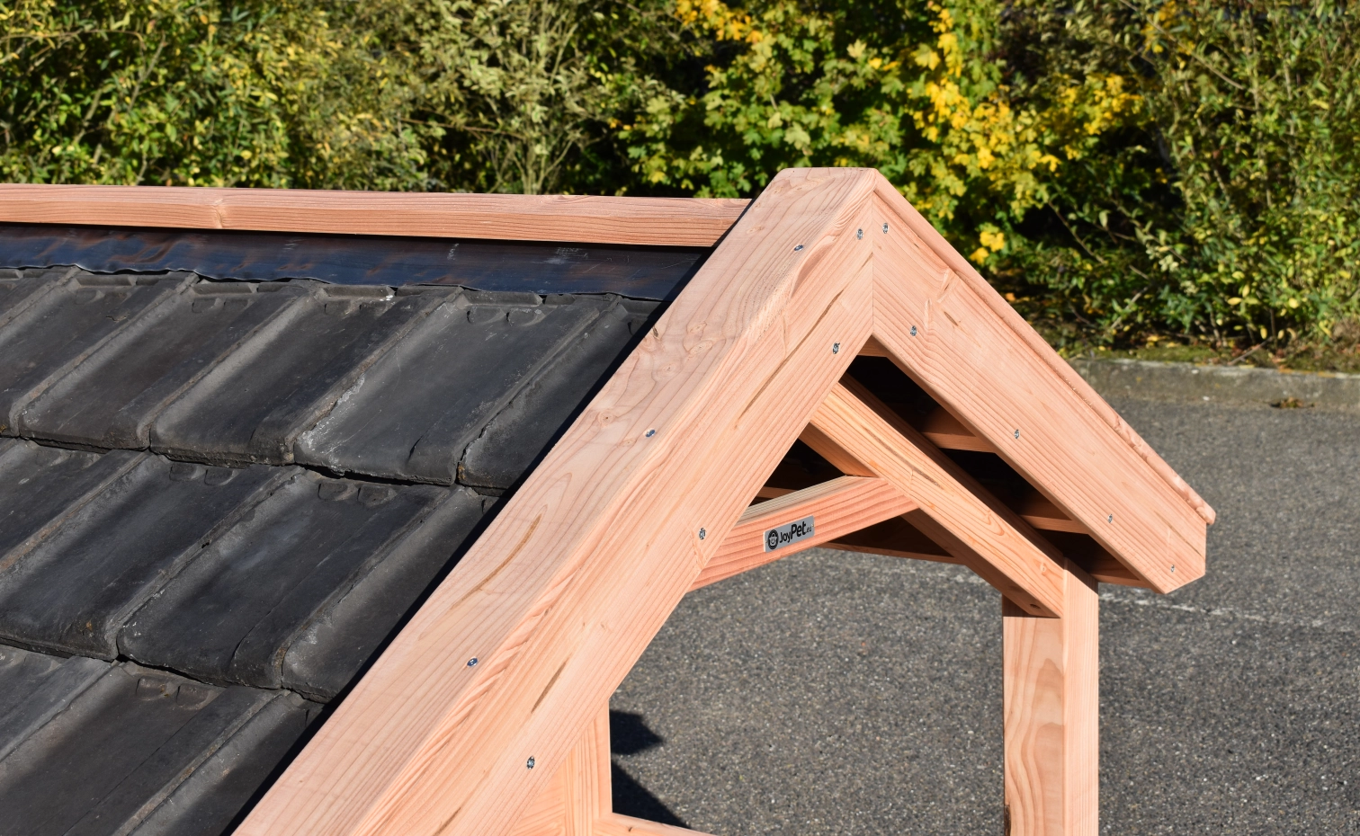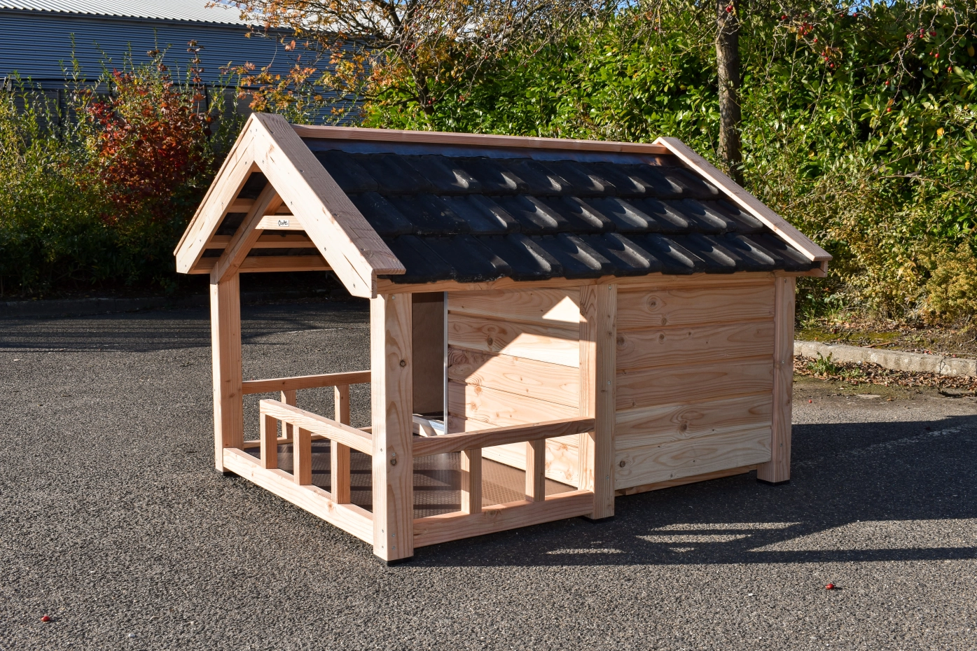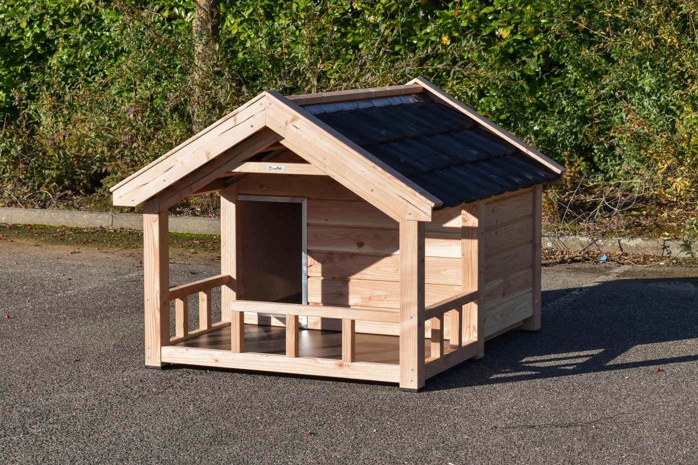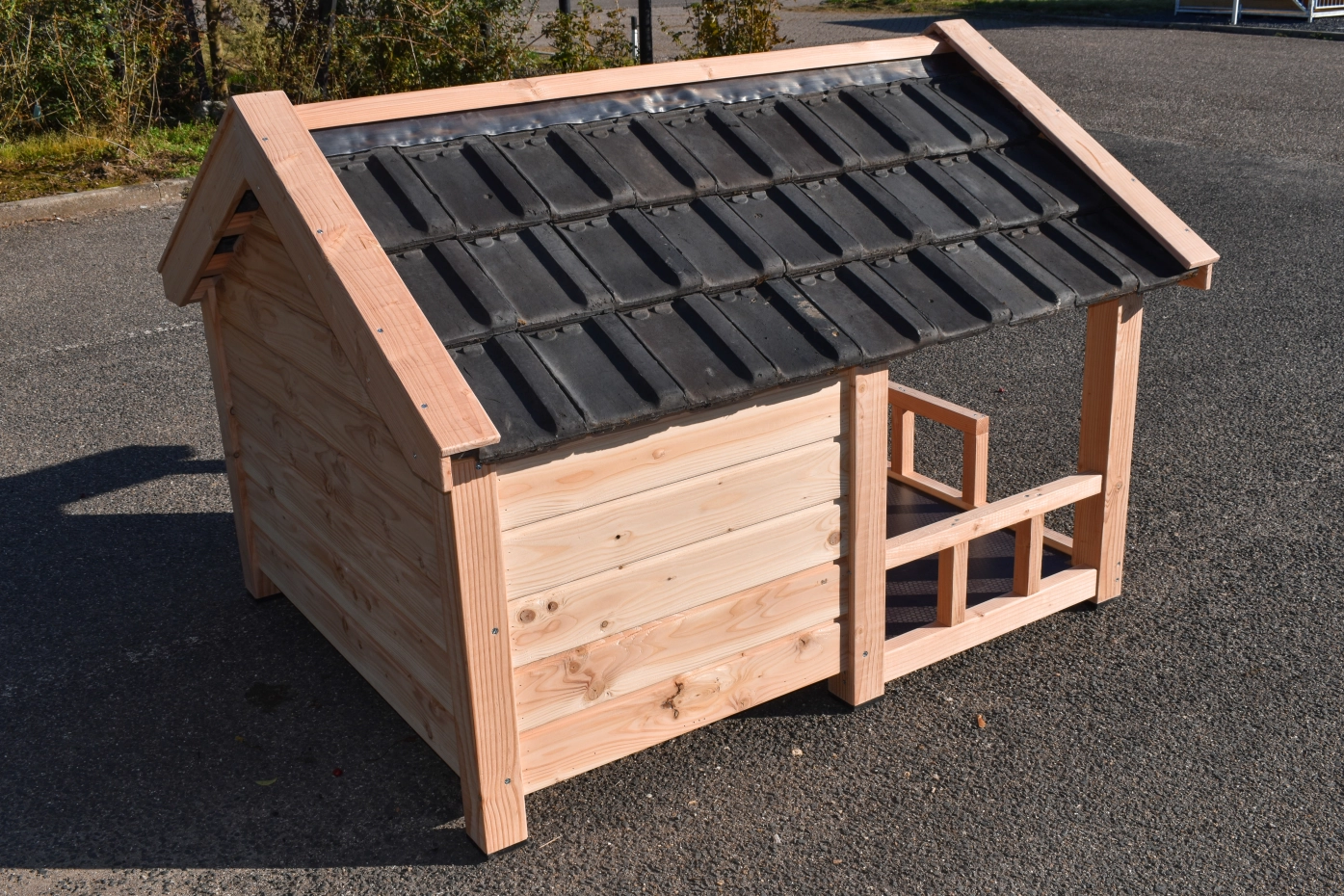 Dog house Reno is an insulated dog house with Veranda, made of Douglaswood. The house is provided with second-hand tiles. The walls are 7cm thick. The house is suitable for dogs, such as Golden Retriever, Dutch Shepherd, Labrador Retriever. Top quality for your friend!