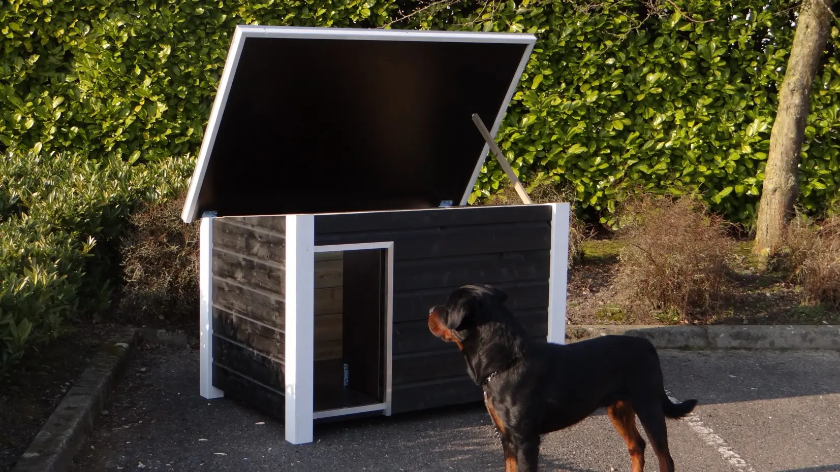 The Wolf Black-White dog house is a stunning, modern outdoor shelter for your dog. Its sleek design, excellent insulation, and maintenance-free build ensure top quality. The insulation keeps your dog warm and comfortable even in winter. Suitable for breeds such as German Shepherd, Labrador, and Belgian Malinois.