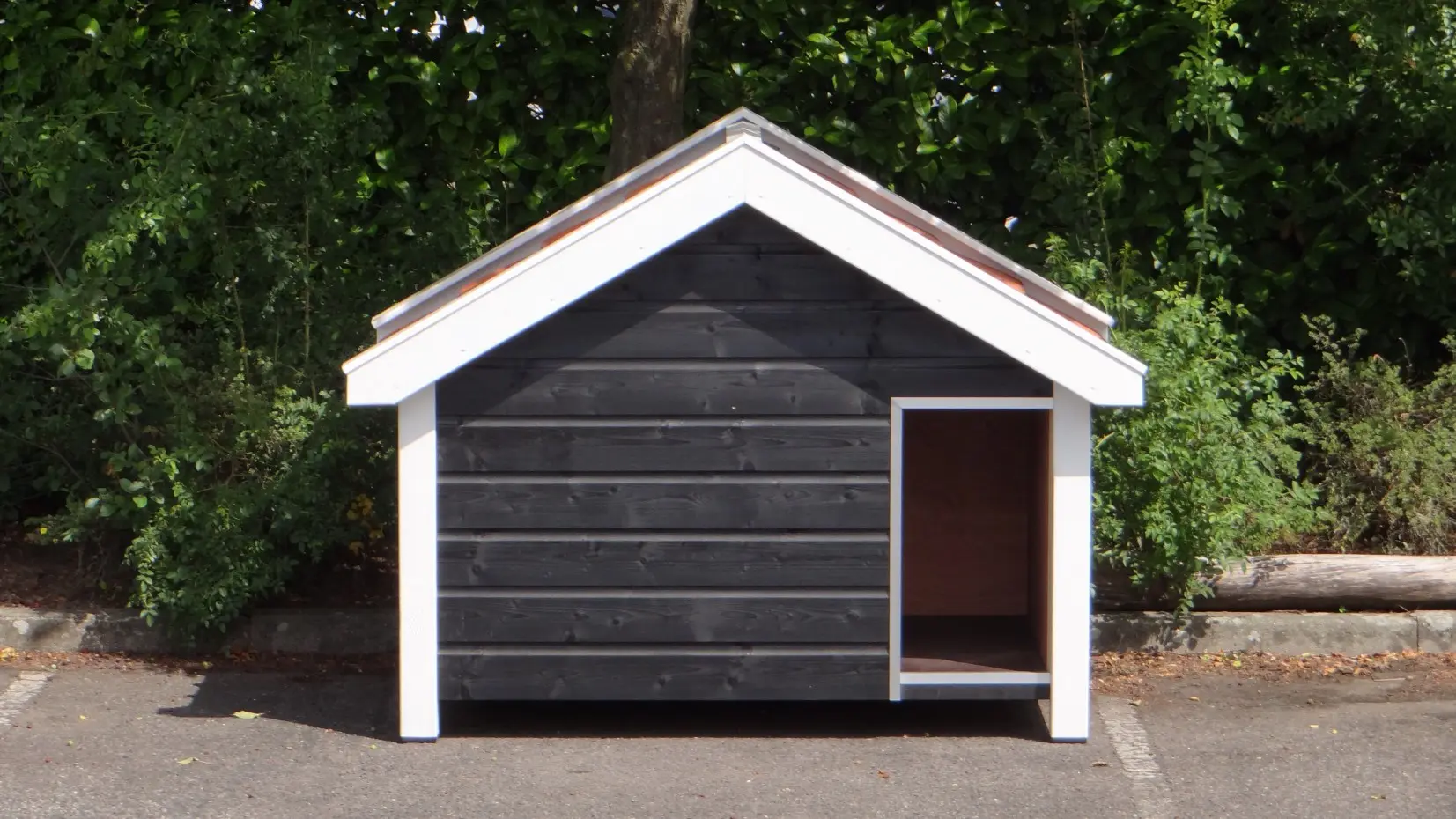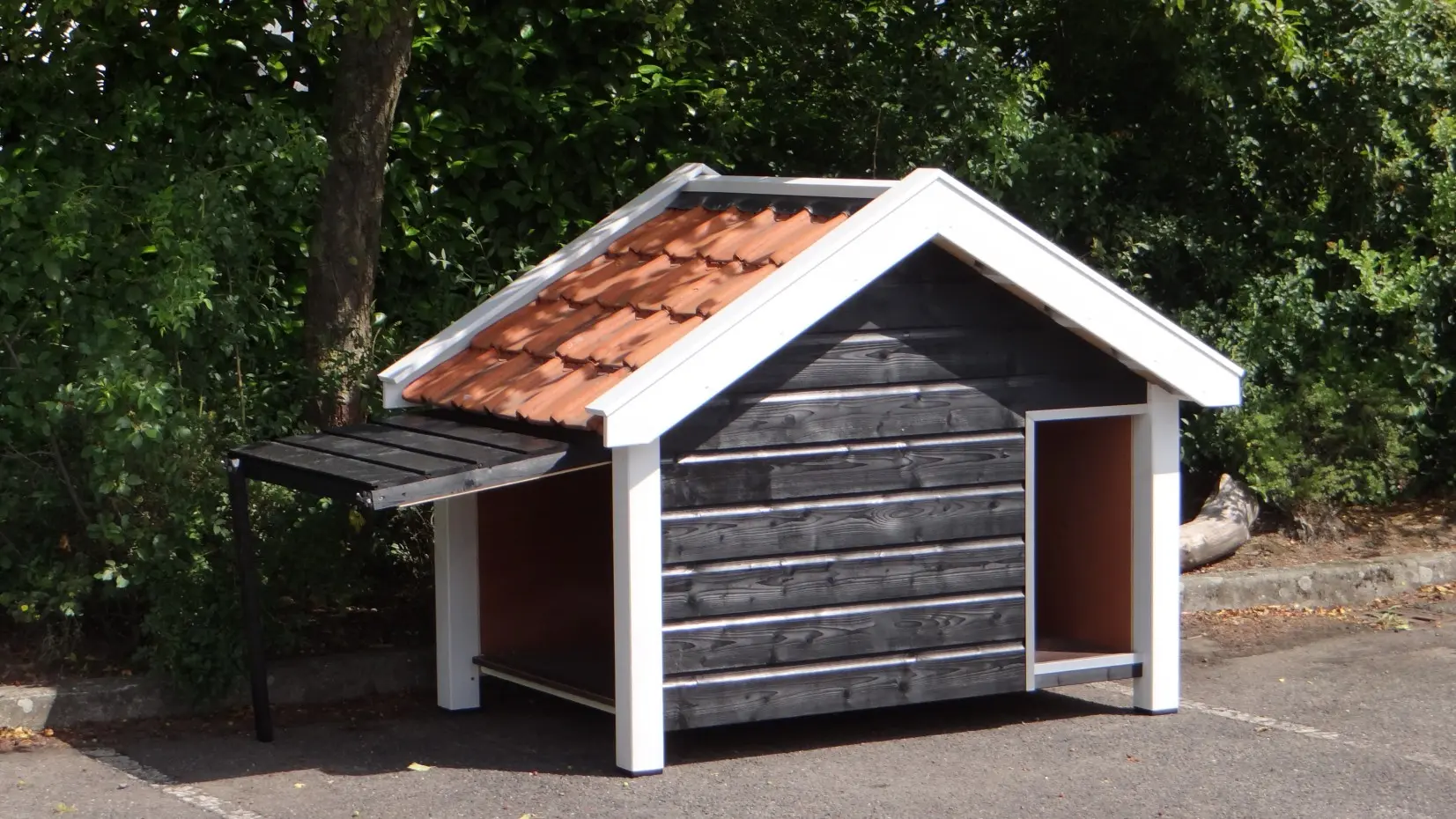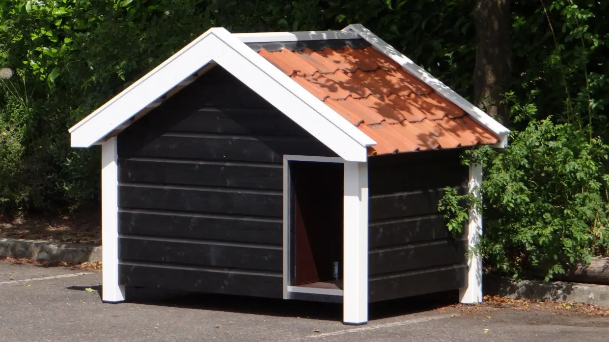 - This doghouse is equipped with used ceramic roof tiles.