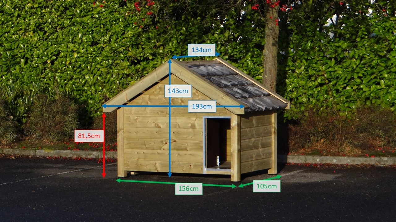The Snuf Insulated dog kennel is a large doghouse. The doghouse is made from pressure-treated spruce wood combined with betonplex and real roof tiles. Very practical and comfortable! The insulated walls are 7 cm thick. External dimensions approx.: 193 × 134 × 143 cm (W × D × H). Insulated wooden dog kennel of top quality!