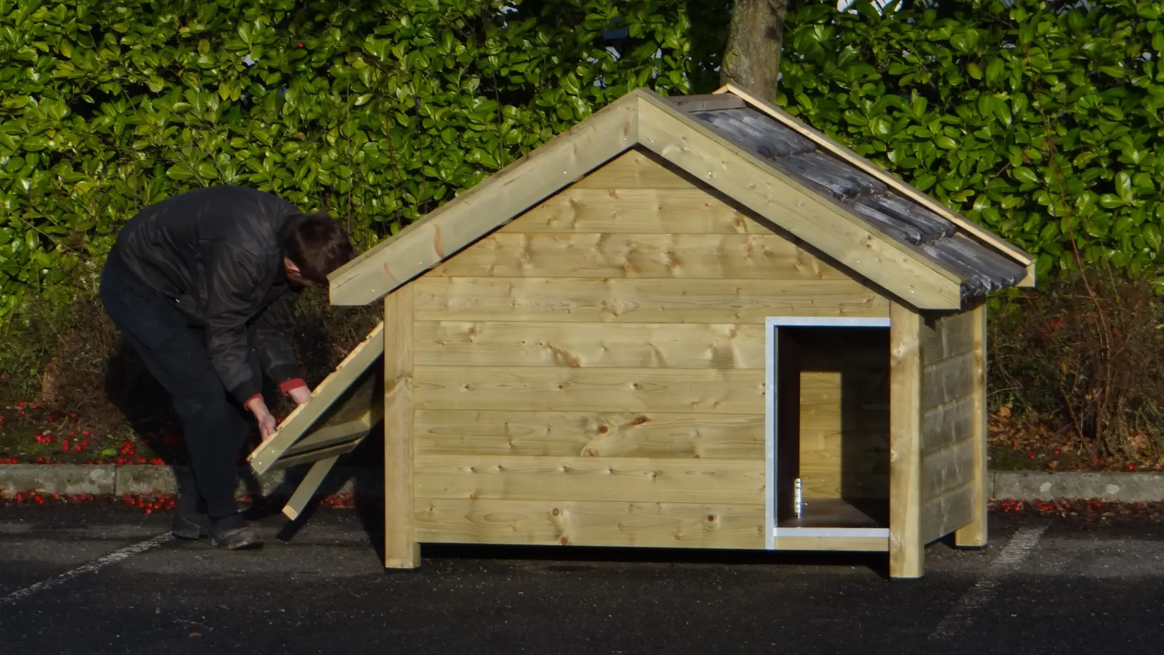 - The doghouse is equipped with a windwall, which can be pushed against the wall as well