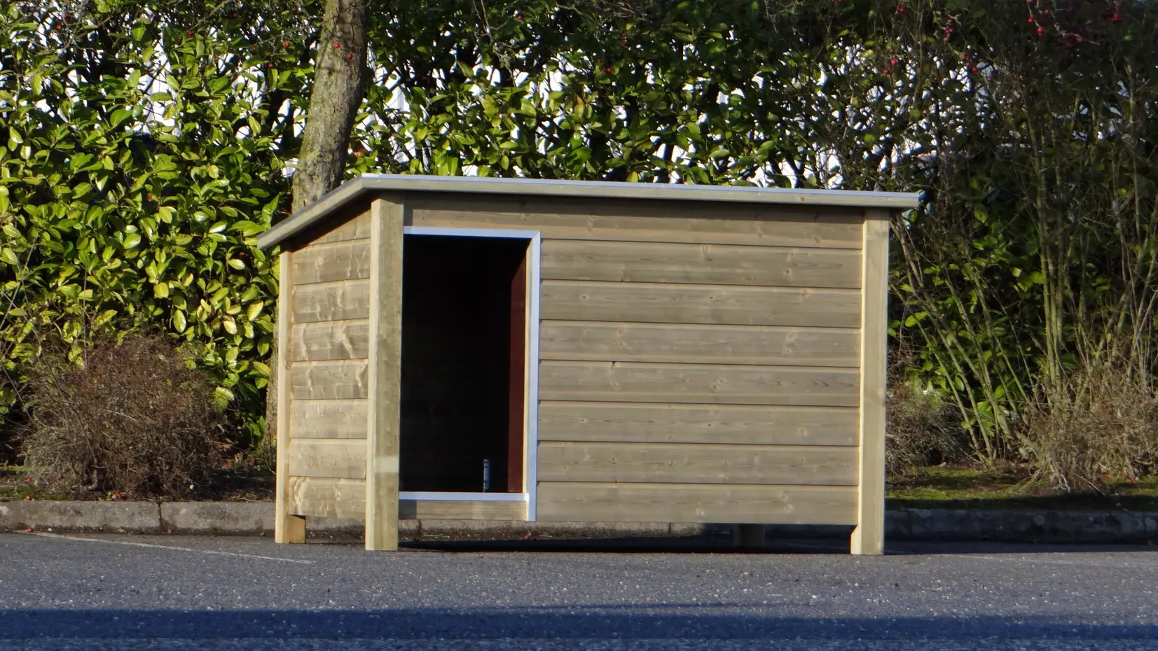 - The doghouse is equipped with a windwall, which can be pushed against the wall as well