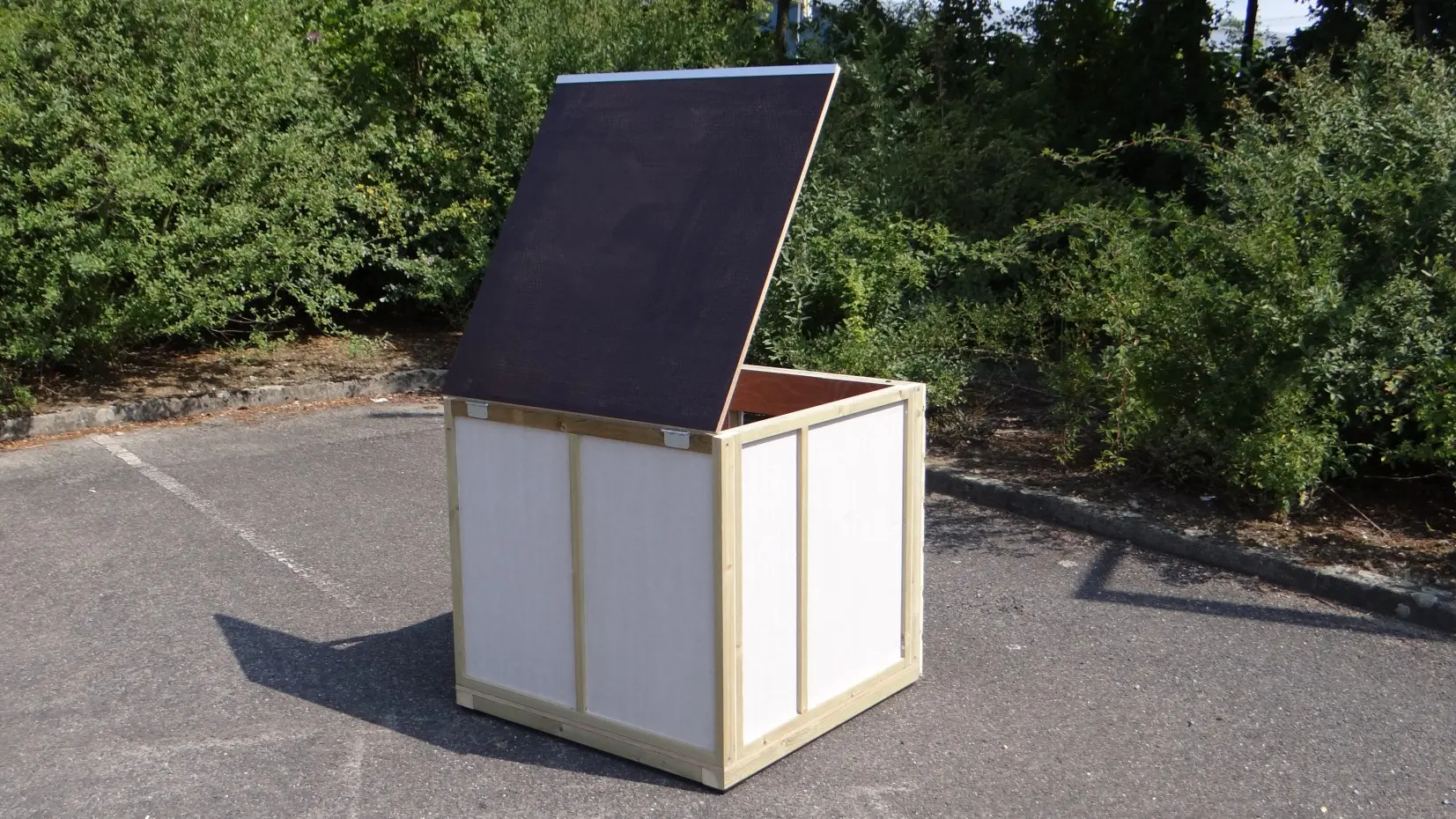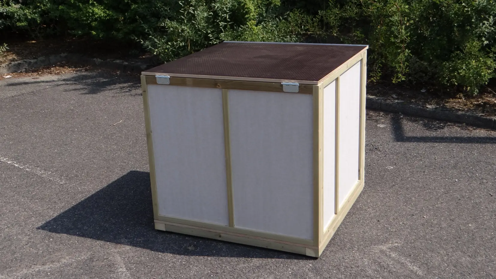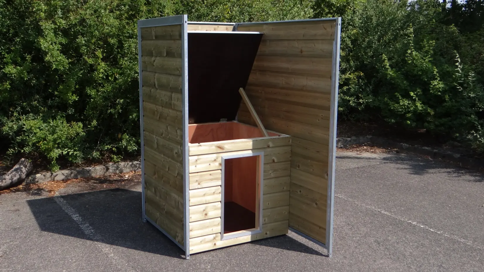 Sleeping compartment insulated Easy 95x95cm is a custom-made hutch to place in a kennel. The sleeping compartment has a roof and a floor of plywood. The walls are isolated with 3cm thick PIR-isolation. The opening is provided with aluminum chewprotection. The hutch has a hinged roof.