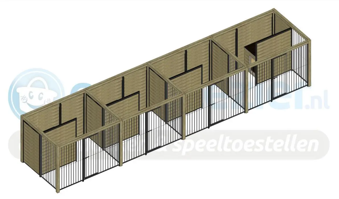 The COMPART dog kennel, made of beautifully impregnated spruce wood, is ideal for housing 4 dogs while keeping them separated. The kennel is equipped with 4 sleeping houses, 4 platforms in front of the sleeping houses, and 4 dog runs. To keep the dogs apart, the kennel is fitted with partition walls.