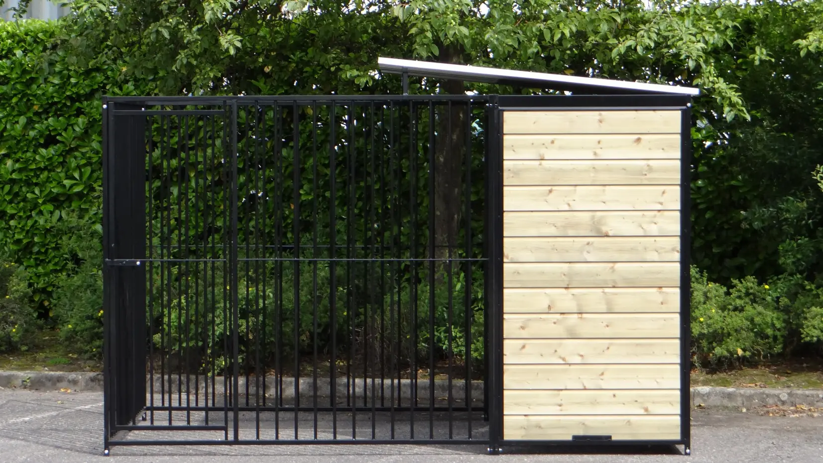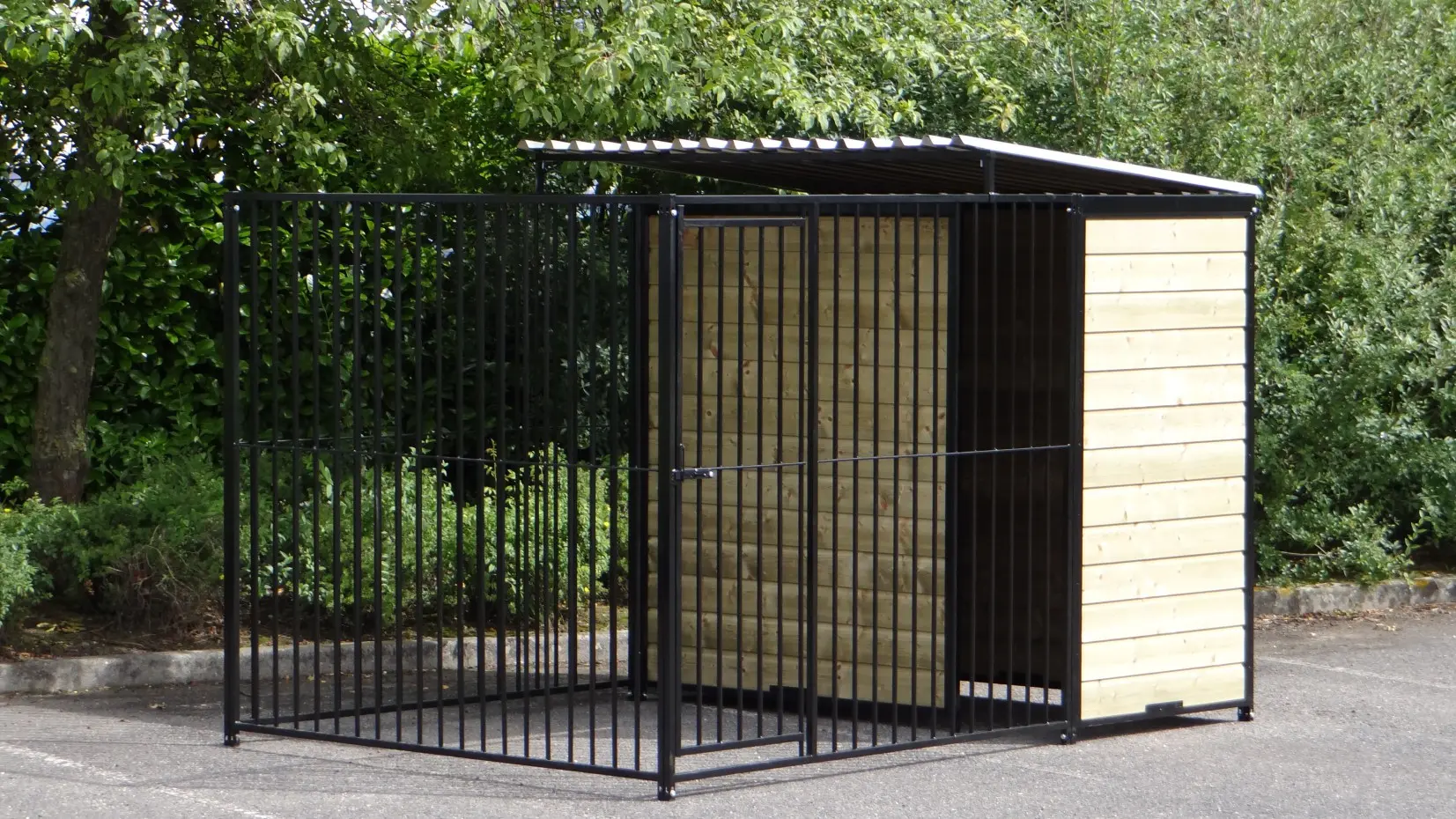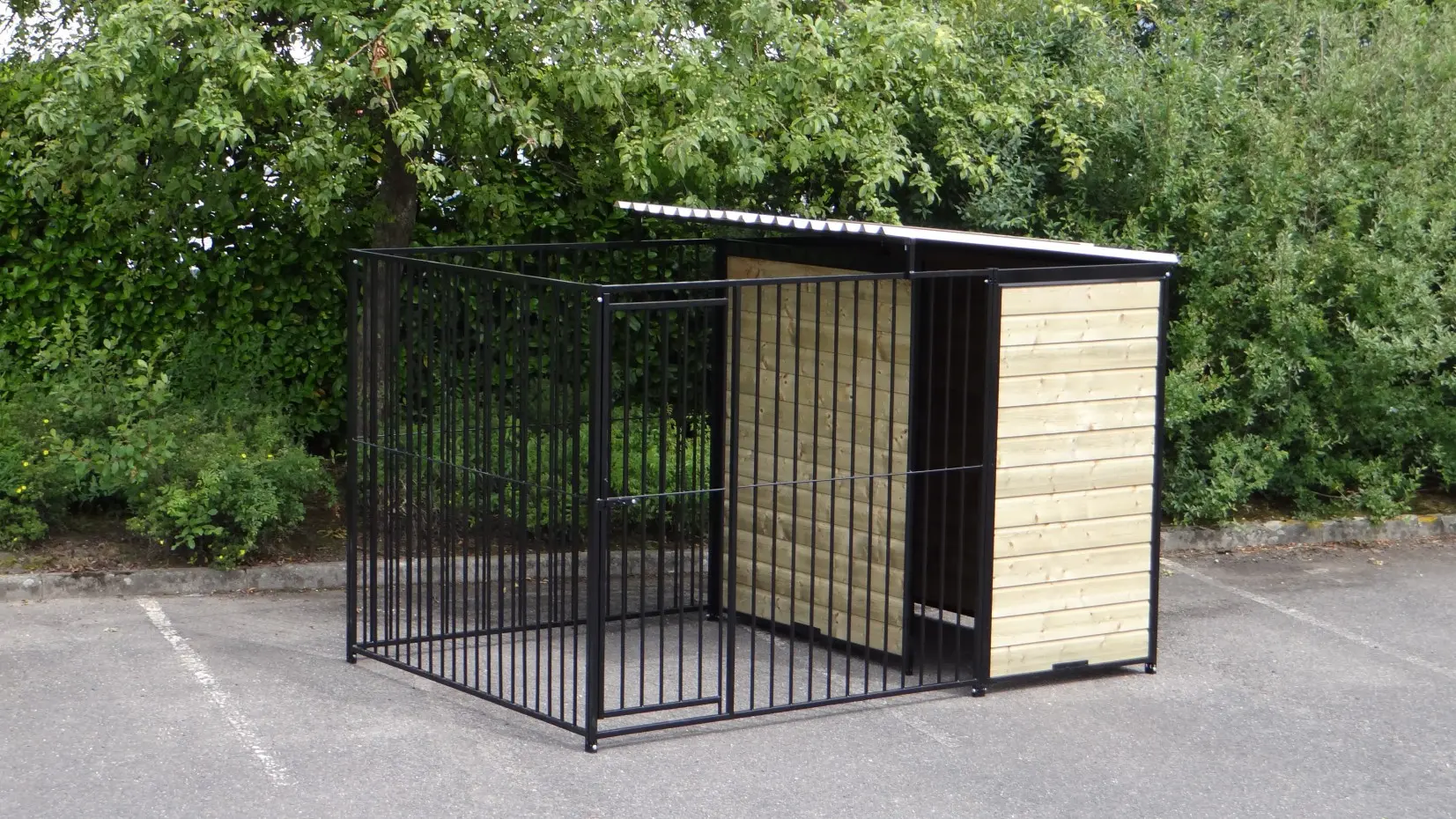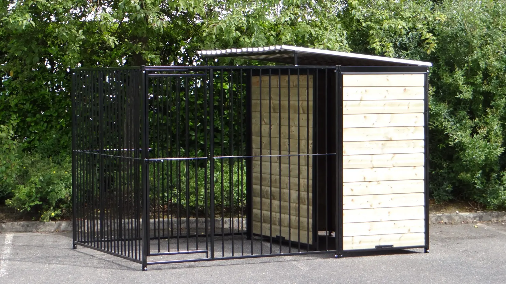 This strong, black powdercoated dog kennel is a wonderful dog kennel for your dog. Equipped with a half roof and wooden walls. The kennel is 3 x 2 meter and the kennel has a windwall for an optimal protection for your dog.